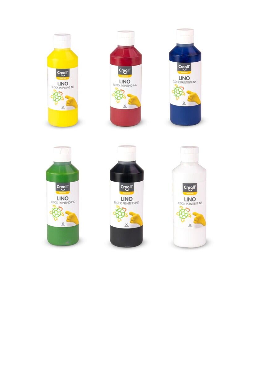 6x500 ml/pk. En vandopløselig kvalitetstrykfarve, som kan anvendes til mangefarvet trykarbejde. Farverne kan blandes med hinanden ved specielle nuancekrav og bruges til linoleum, bogtryk og dybtryk. Indeholder farverne gul, rød, blå, grøn, sort og hvid.