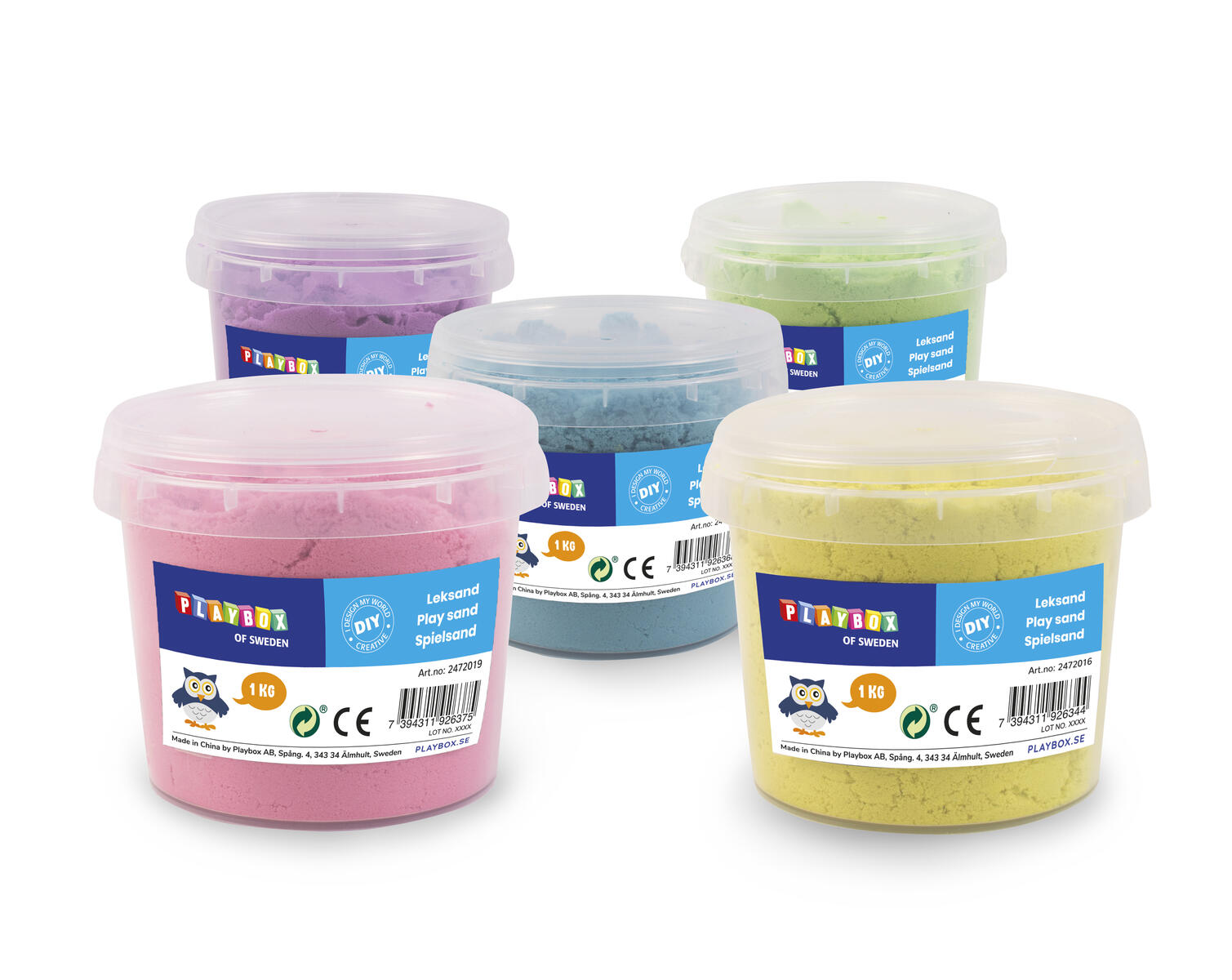 1 kg/pk. Blødt legesand i klare farver, som er let at forme. Når farverne først er blandet sammen, kan de ikke adskilles igen. Pakket i transparent spand med låg. Spanden kan bruges som form til et bjerg eller slot. For blødere sand spray lidt vand på, og ælt det blødt. Glutenfri og uden konserveringsmidler. Sandet er godkendt fra 3 år, men anbefales fra 5 år.