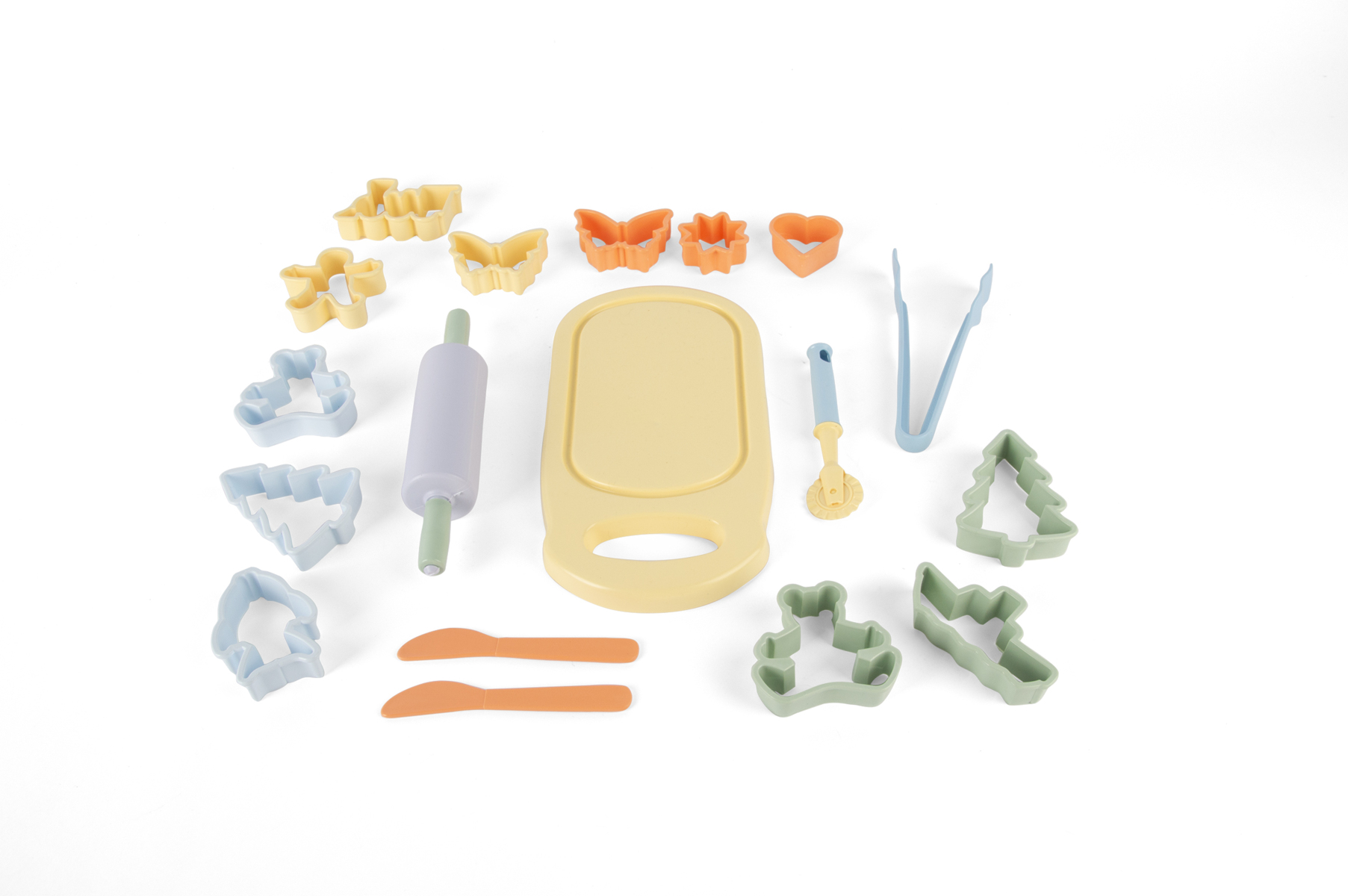 18 stk./pk. Indeholder: 12 forskellige forme, 2 knive, tang, rissehjul, kagerulle og arbejdsplade. Af genanvendt plast. Svanemærket, licensnummer 50950001. Fra 2 år.