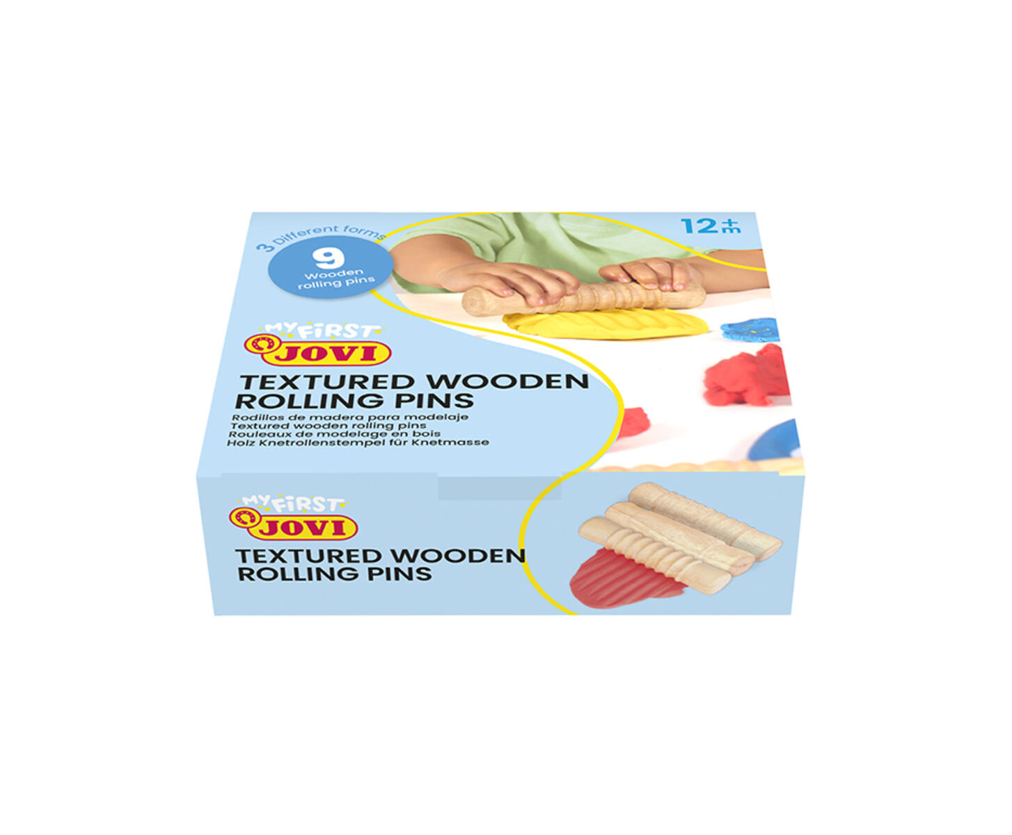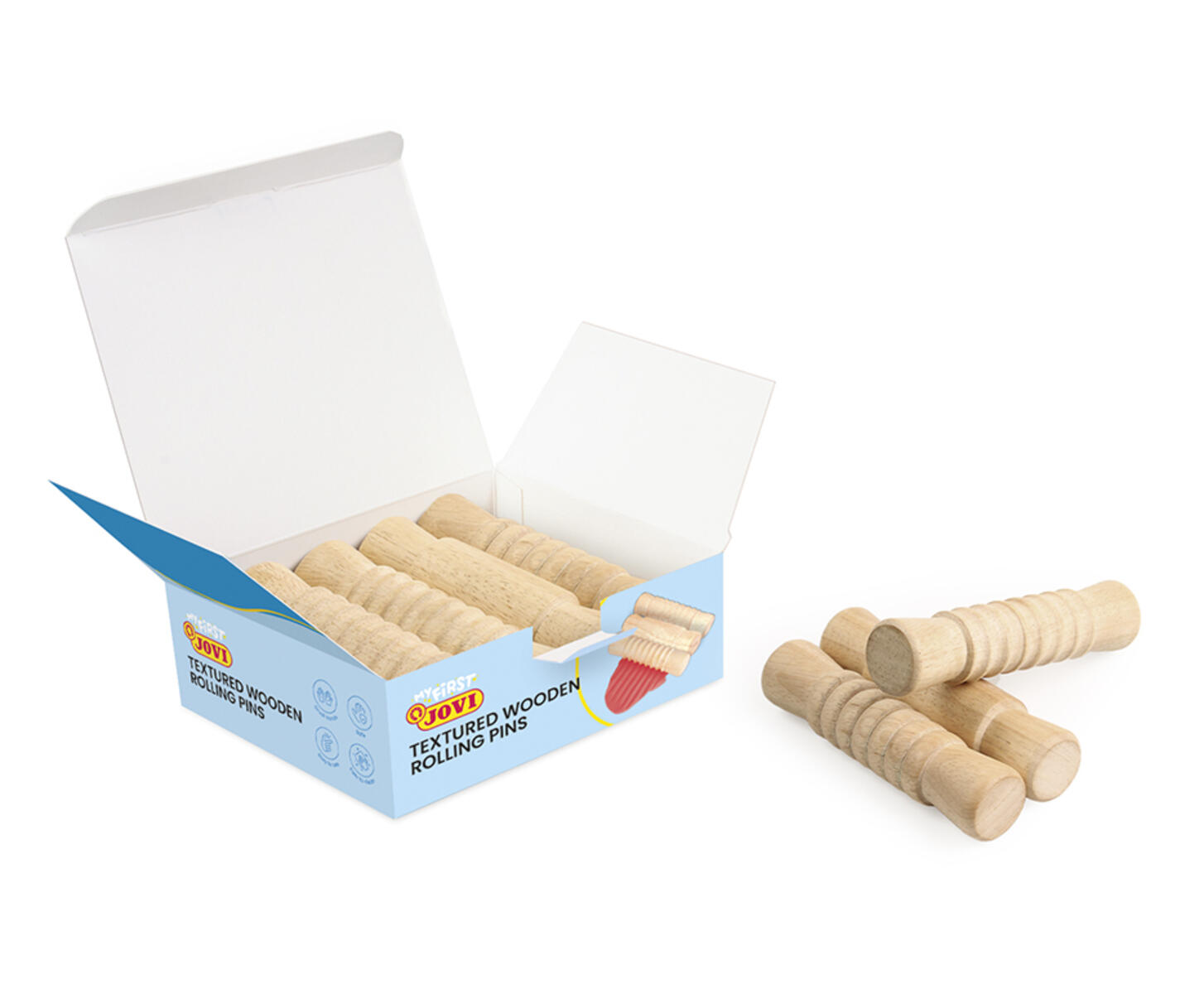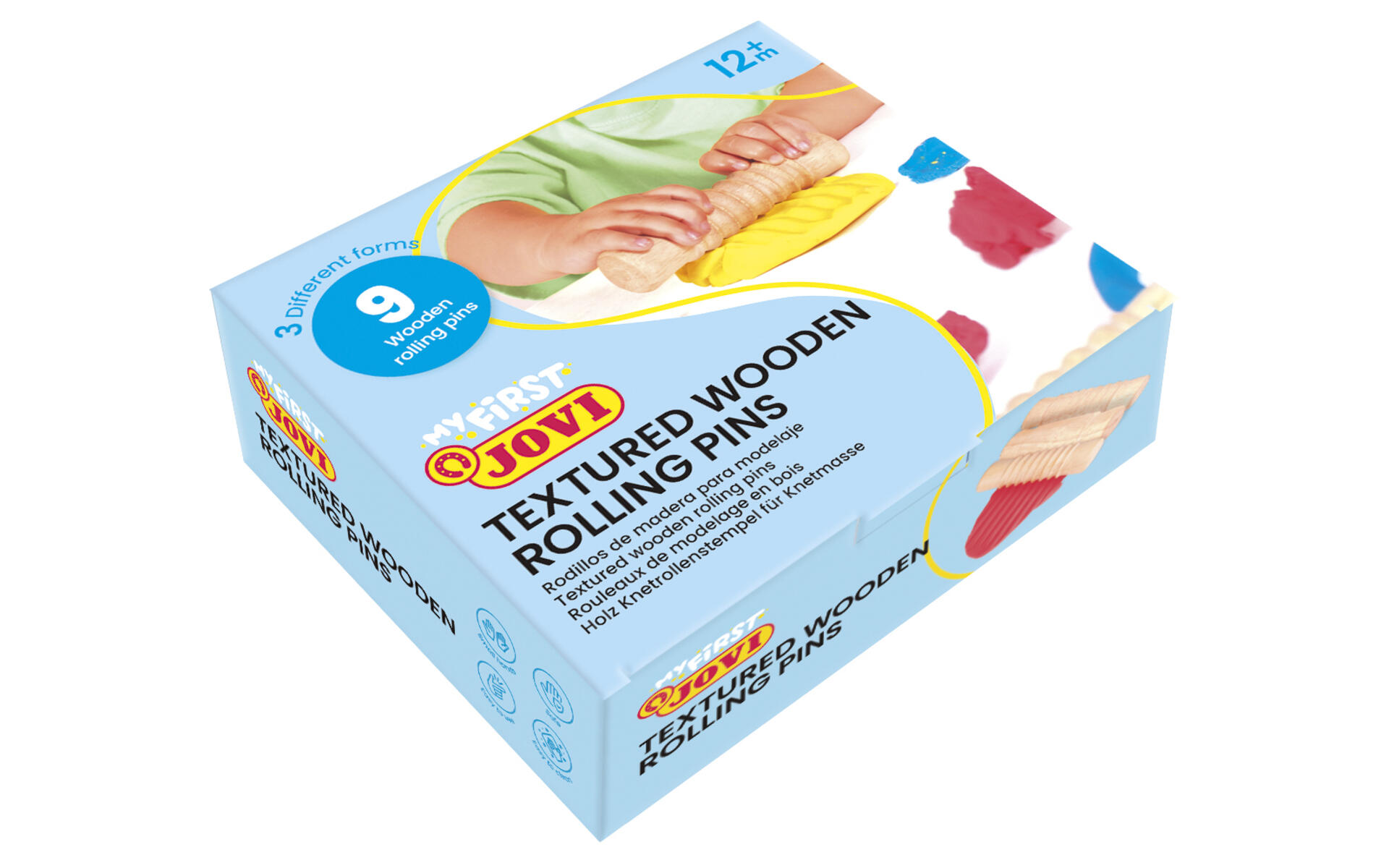 9 stk./pk. Træruller med tre forskellige mønstre, 3 af hver. Nemme at gribe for små hænder.