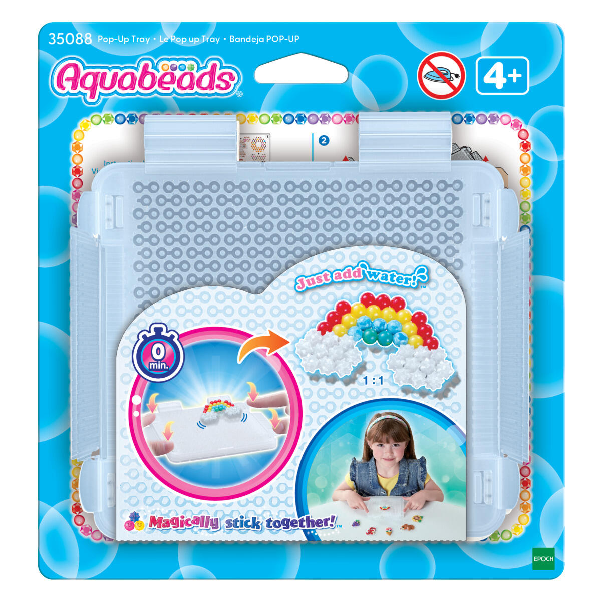1 stk./pk. Aquabeads Pop-up perleplade, hvor du kan skabe kreative motiver med Aquabeads-perler. Læg en skabelon under pladen, placer perlerne, spray med vand og lad tørre. Drej på knappen, til det klikker, så motivet popper op og løsner sig nemt. Fremstillet i PP. Tørres af ved behov, må ikke stryges. Anbefalet fra 4 år.
