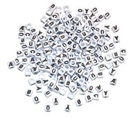 600 stk./pk. Kubeformede bogstavperler med sorte tegn med hvid bund. Indeholder hele det nordiske alfabet. Bogstaverne er indgraveret i perlen, hvilket gør, at farven holder længere. Ø6,5 mm. Hul Ø2,5 mm. Af PS. Fra 3 år.