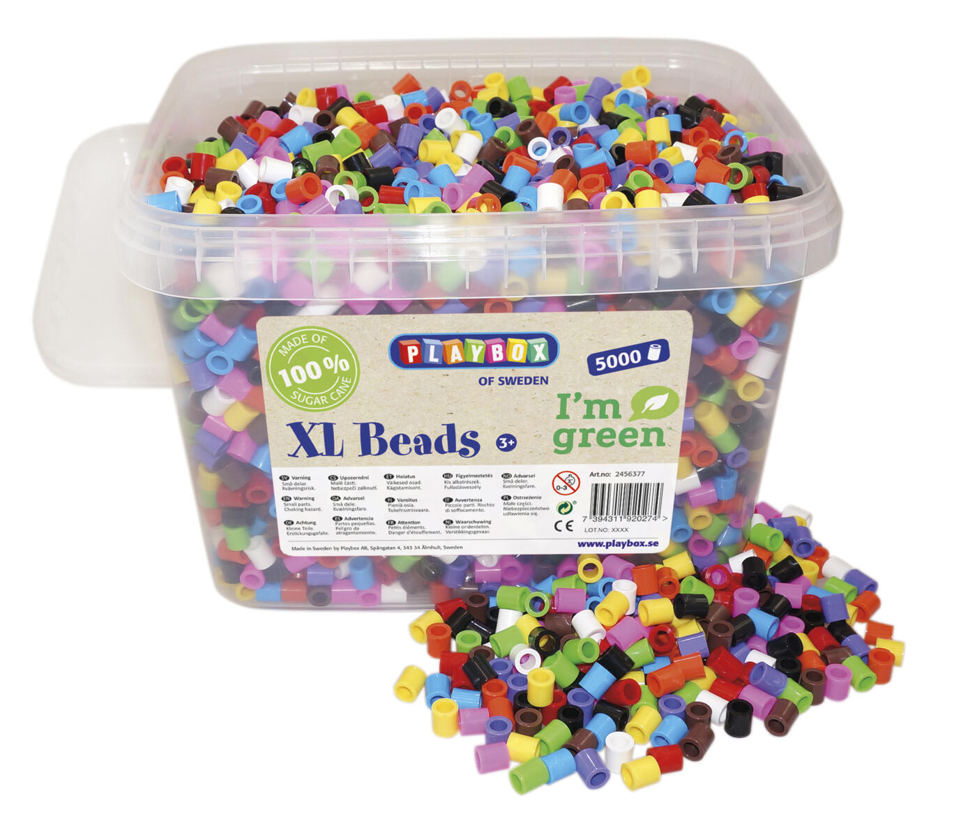 5.000 stk/pk. XL-perler af bioplast i blandede farver. Bioplasten laves af sukkerrør. Leveres i transparent bøtte med låg. Rørperlerne kan bruges sammen med XL-plader. Fra 3 år.