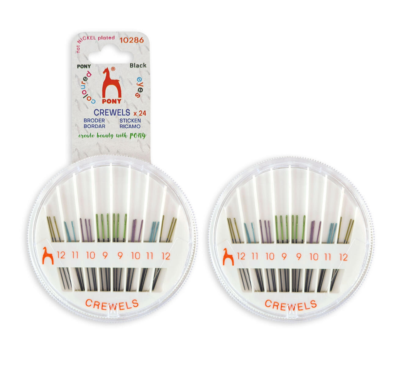 24 stk./pk. Nikkelfri broderinåle med farvet nåleøje. 6 stk. af hver størrelse 9, 10, 11 og 12.