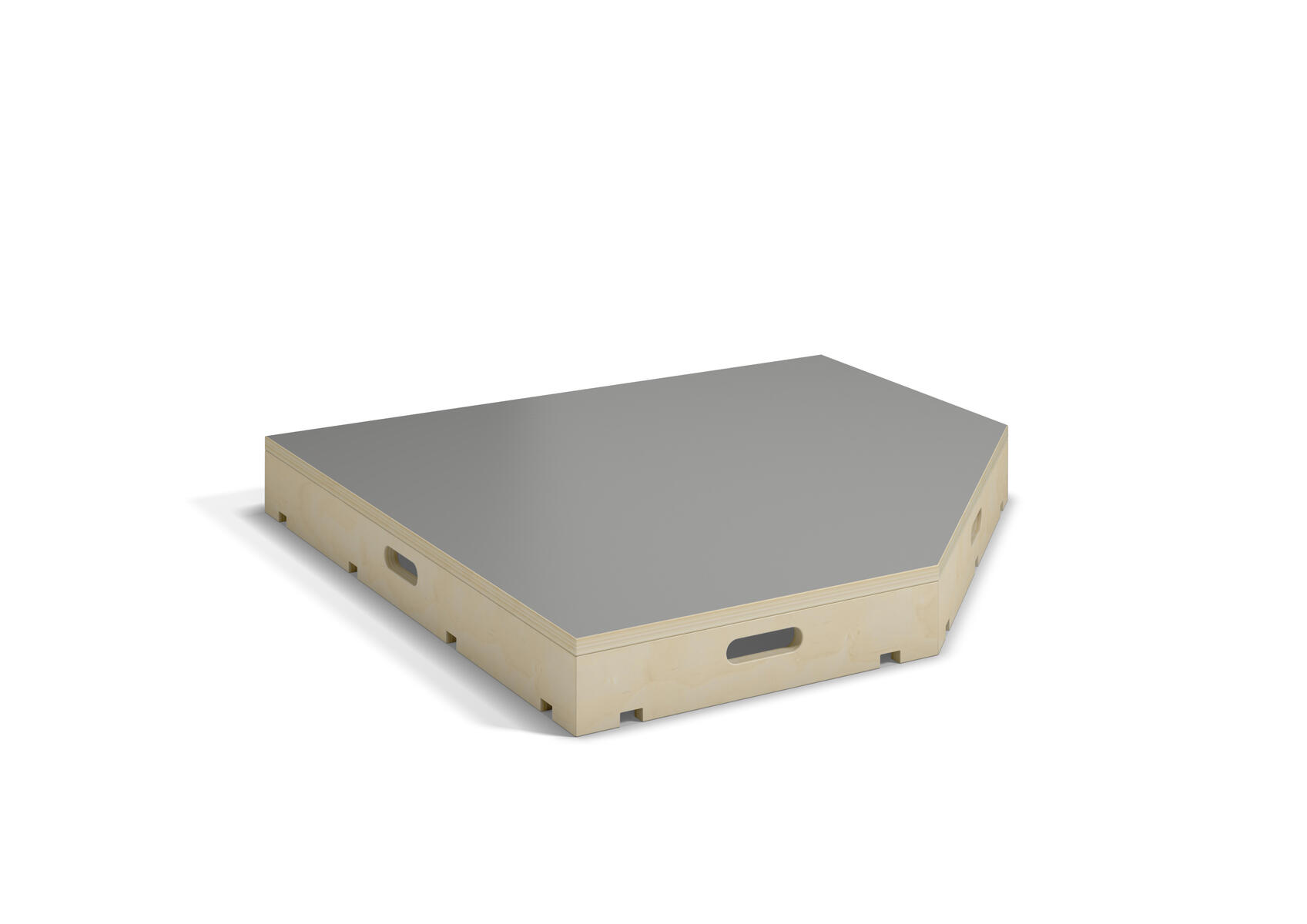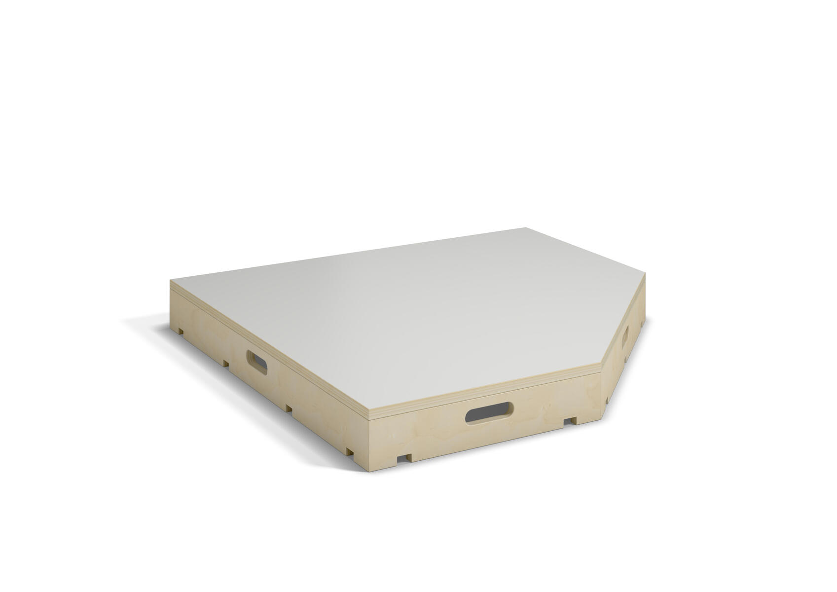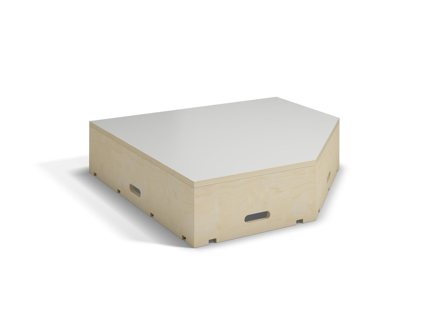 Scenemodul med riflet overflade i fenolfilm for bedre greb og skridsikring. Med udfræsede håndtag. Hvidpigmenteret birkekrydsfinér med grå top. Højde 30 cm. Indeholder: 8 firkanter, 4 rektangler, 2 trekanter og 1 scenetrappe.