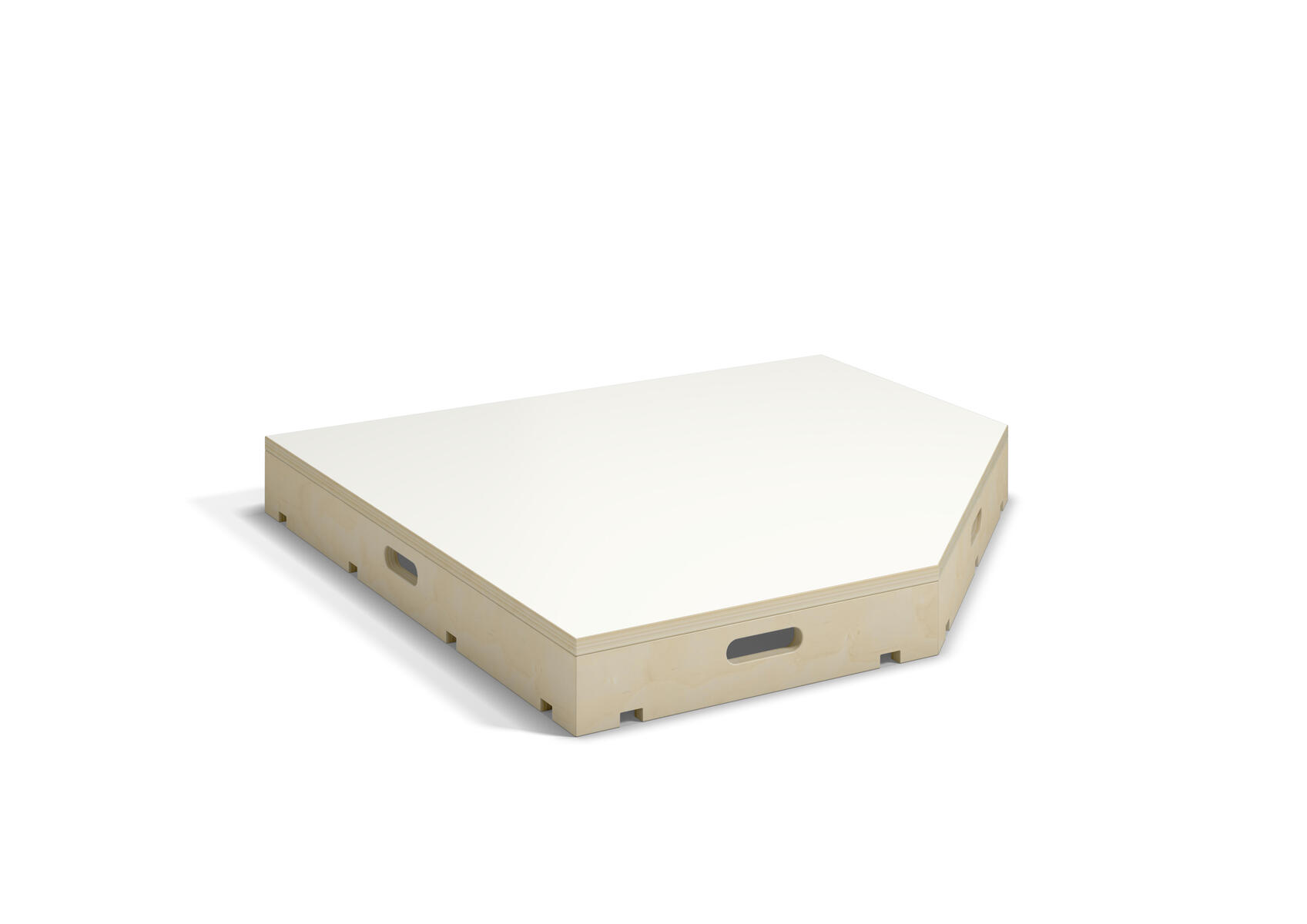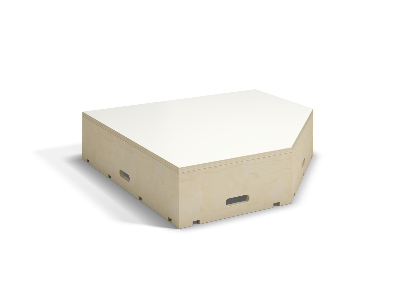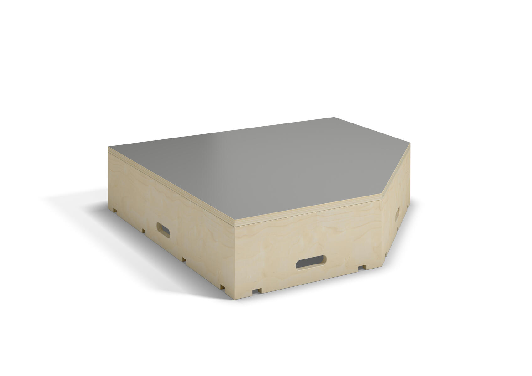 Scenemodul med riflet overflade i fenolfilm for bedre greb og skridsikring. Med udfræsede håndtag. Hvidpigmenteret birkekrydsfinér med grå top. Højde 30 cm. Indeholder: 8 firkanter, 4 rektangler, 2 trekanter og 1 scenetrappe.