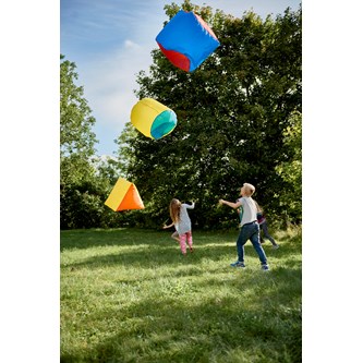 Et sæt med 3 forskellige fjerlette former som bogstaveligt flyver i luften. Indeholder formerne kube, cylinder og pyramide. Kan bruges både ude og inde. Formerne bevæger sig i et roligt tempo, som gør det let for alle at deltage. Bruges ved f.eks. samarbejdsøvelser eller kaste- og gribeaktiviteter. Eftersom svævebolde ikke har inderblære anbefaler vi en pumpe med høj kapacitet, f.eks. elektrisk boldpumpe med varenr. 71996 eller en løvblæser. Så tager det ca. 5 min at pumpe alle tre op, hvor det vil tage ca. 15-20 min med en almindelig pumpe. Mål: 91 cm. Af nylon og polyester.