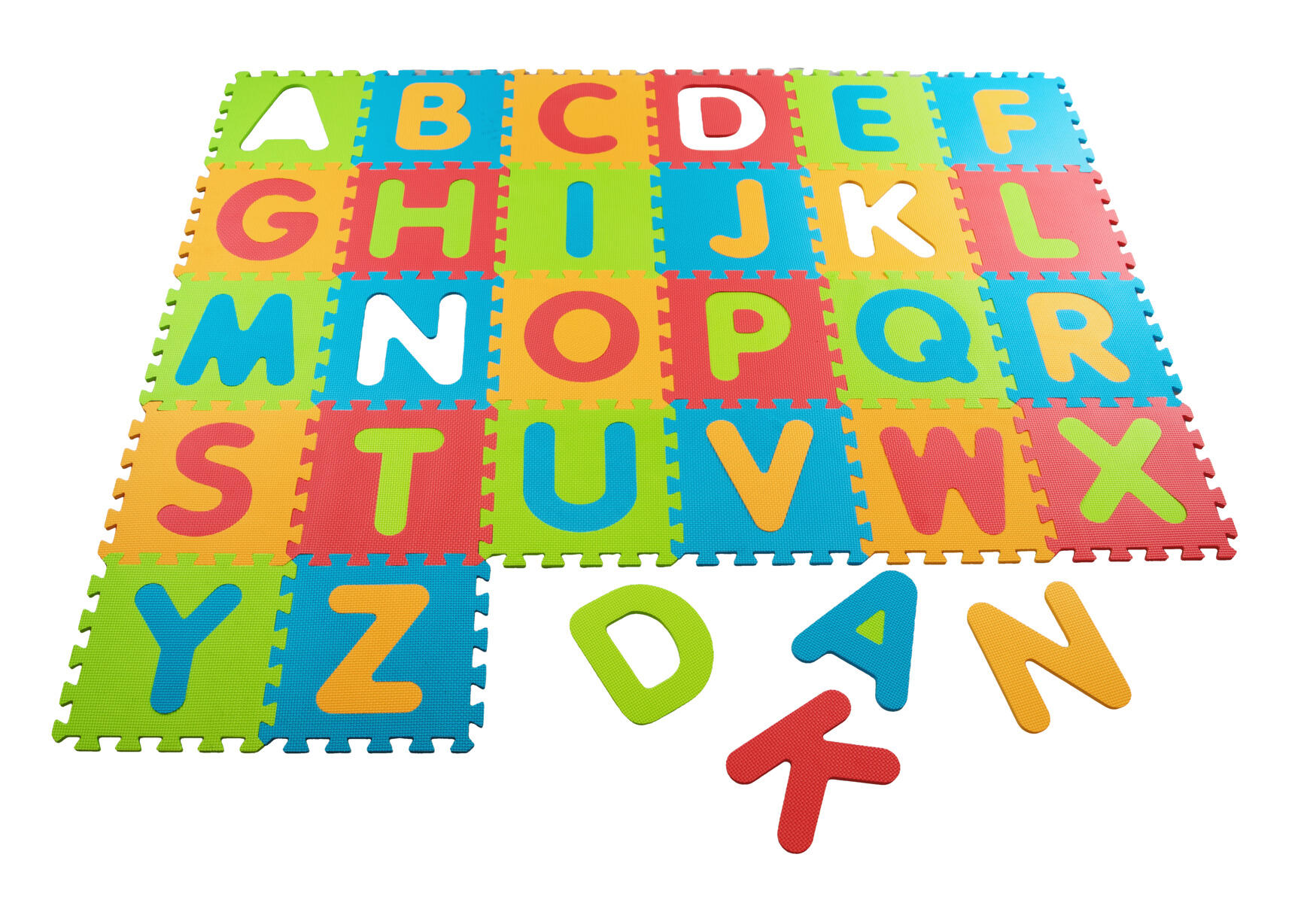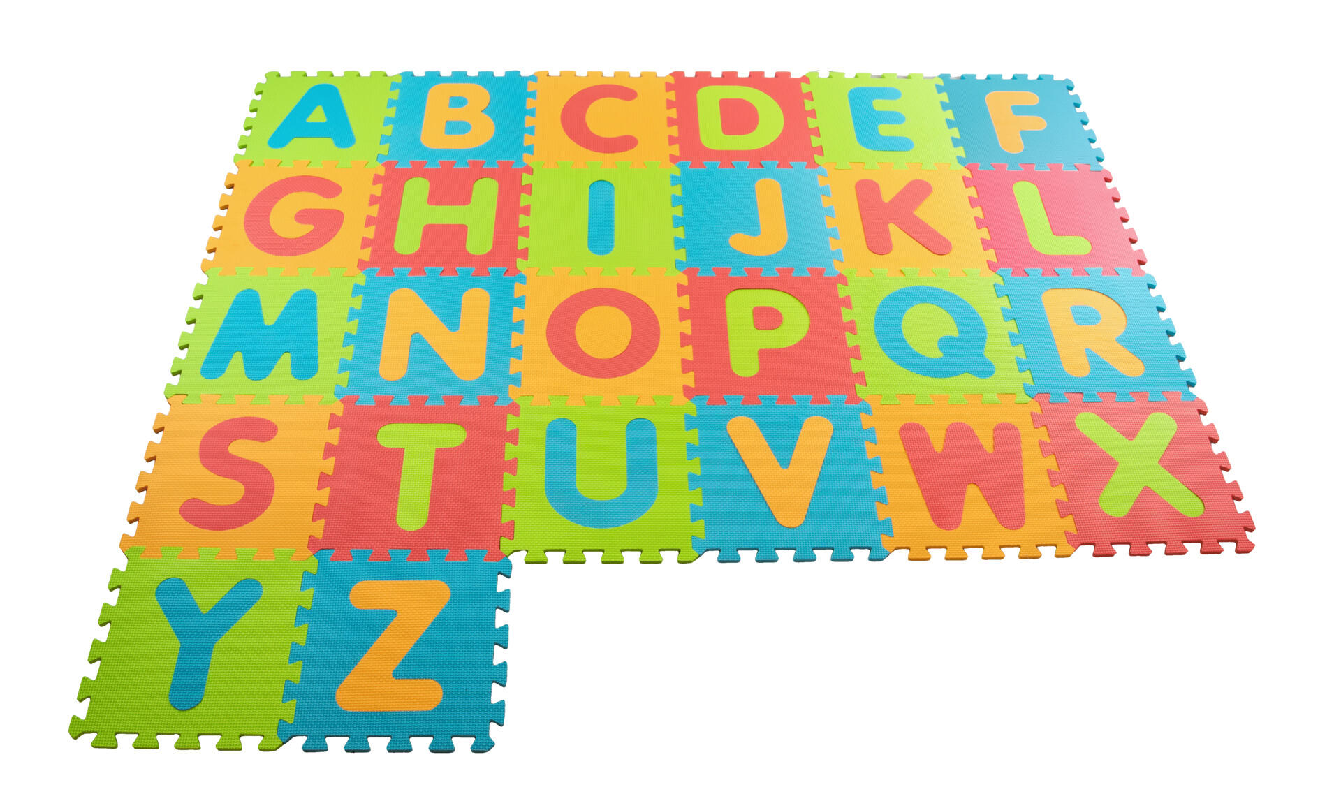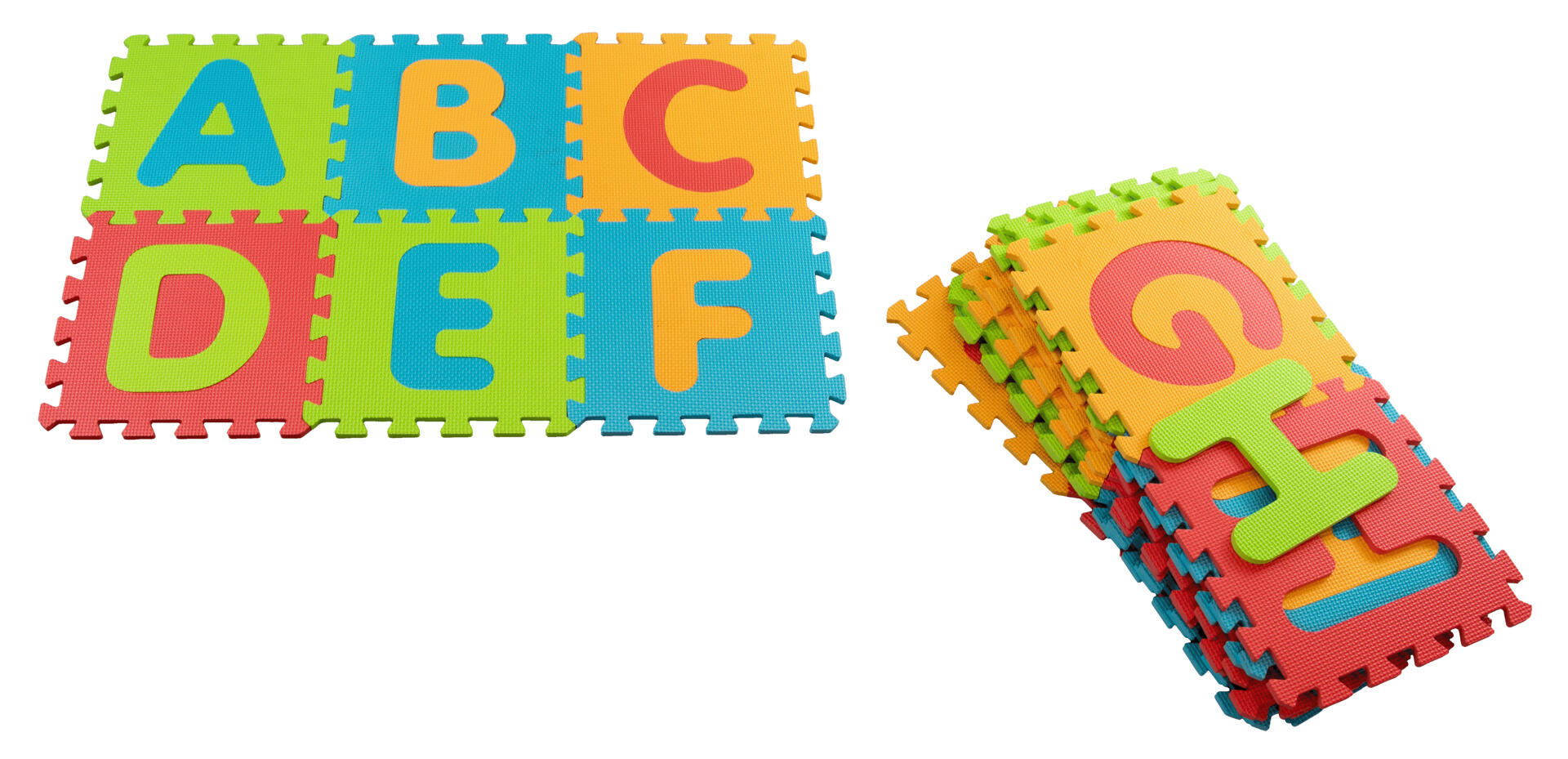 26 stk./pk. En lyddæmpende legemåtte, der kan bruges både som puslespil og som underlag til leg på gulvet. Indbyggede bogstaver, der også fungerer som puslespilsbrikker. Mål: 32 x 32 x 1 cm. Af EVA. PVC-fri. Fra 1 år.