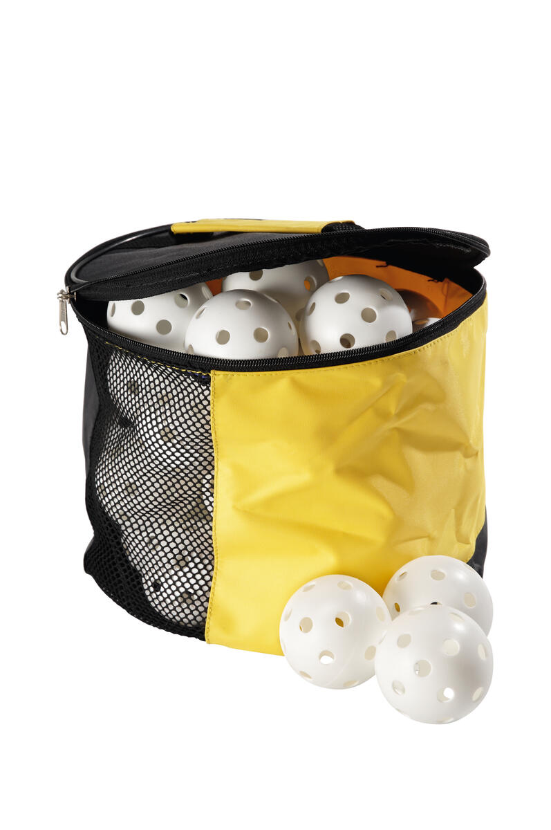 27 dele. Her er alt, hvad du skal bruge for at organisere øvelser med faldskærmen. Sættet indeholder: 6 bean bag-frøer, 2 store bolde Ø35 cm, 6 gribebolde Ø7 cm, 12 legebolde Ø10 cm af PVC, uden forbudte ftalater, samt en opbevaringspose.