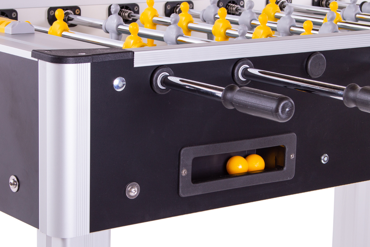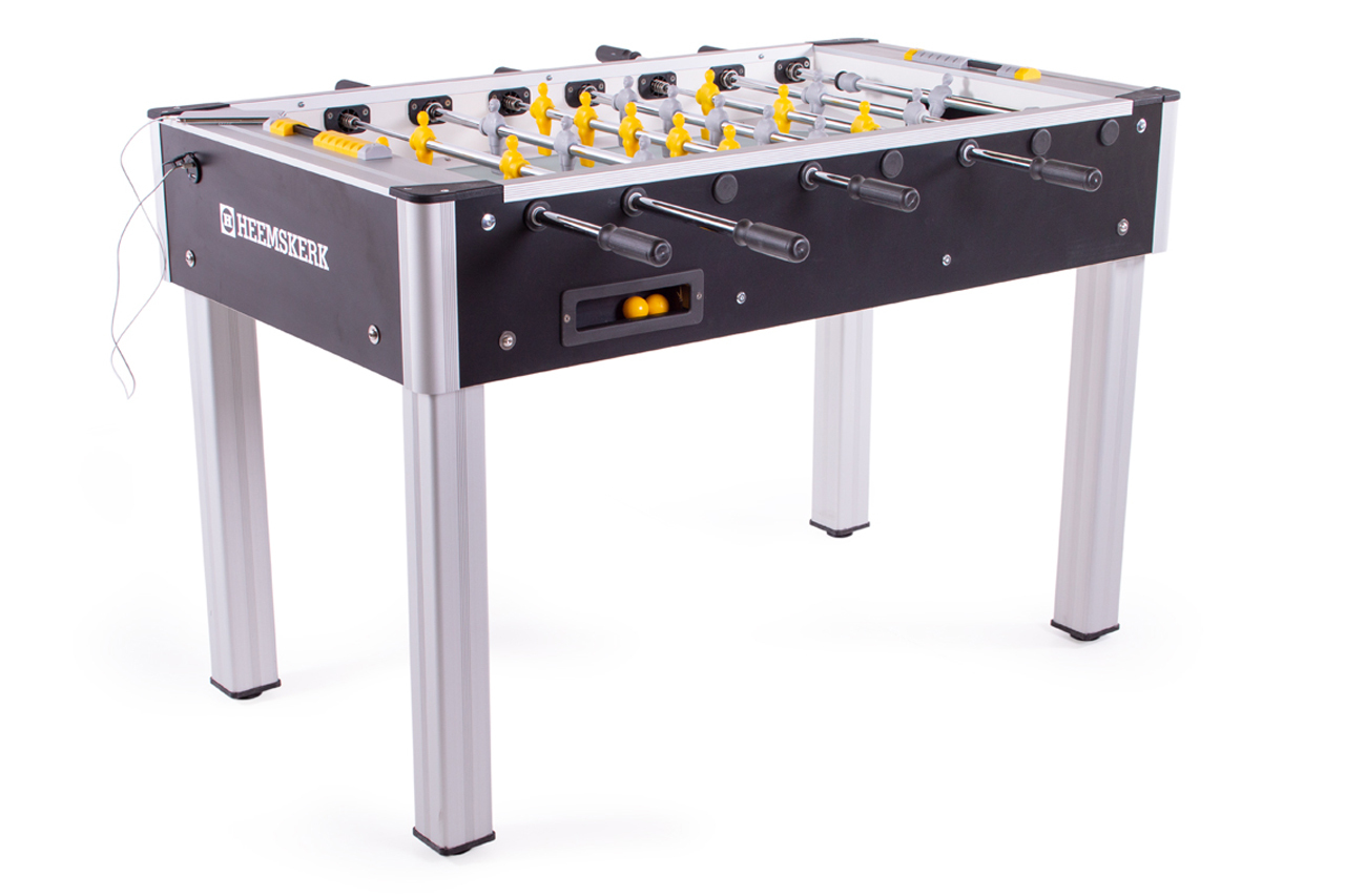 Bordfodbold i kraftig kvalitet som tåler hårdt slid. Vinklet spilleplade i hjørnerne så bolden aldrig ligger stille. Fremstillet i laminat med ben i metal. Solide teleskopstænger med spillere som er formet til at give bedst mulig boldkontrol. Leveres usamlet. Mål: 126x76x92 cm. Vægt 70 kg.