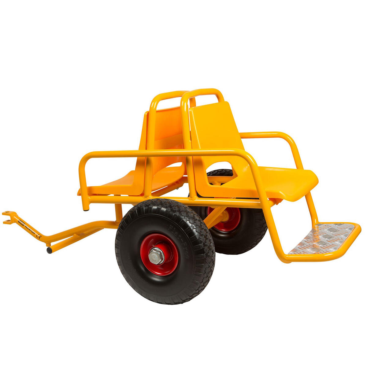 Den såkaldte Double Seats anhænger måler 113 x 55 x 55 cm, og anhængeren er udstyret med stærke plastsæder i slagfast plast med side- og rygstøtte. Hjulene er fremstillet med lukkede kuglelejer.