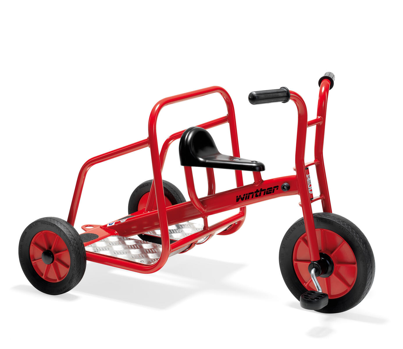 God til rolleleg. Med plads til to passagerer samtidig. Med industrikuglelejer i for- og baghjul, som gør det lettere at træde pedalerne rundt. Siddehøjde 38 cm. Højde 62 cm og bredde 68 cm. Kan kombineres med Winther-anhænger. Vægt 20,4 kg. Enkel montering, vejledning medfølger. Alder 4-8 år.