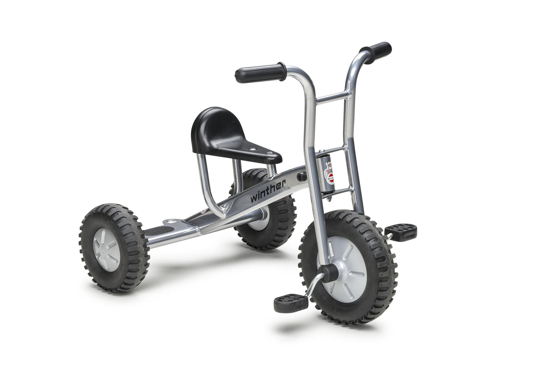 God til rolleleg. Med plads til to passagerer samtidig. Med industrikuglelejer i for- og baghjul, som gør det lettere at træde pedalerne rundt. Siddehøjde 38 cm. Højde 62 cm og bredde 68 cm. Kan kombineres med Winther-anhænger. Vægt 20,4 kg. Enkel montering, vejledning medfølger. Alder 4-8 år.