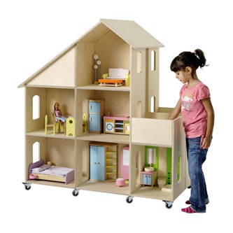Stort dukkehus af god kvalitet med låsbare hjul. Åbent på begge sider med hel mellemvæg. Leveres ubehandlet, så det kan males og tapetseres efter eget ønske. Af birkekrydsfinér. Længde 117 cm, bredde 61 cm, højde 123 cm. Figurer og møbler købes separat. Til placering på gulv.