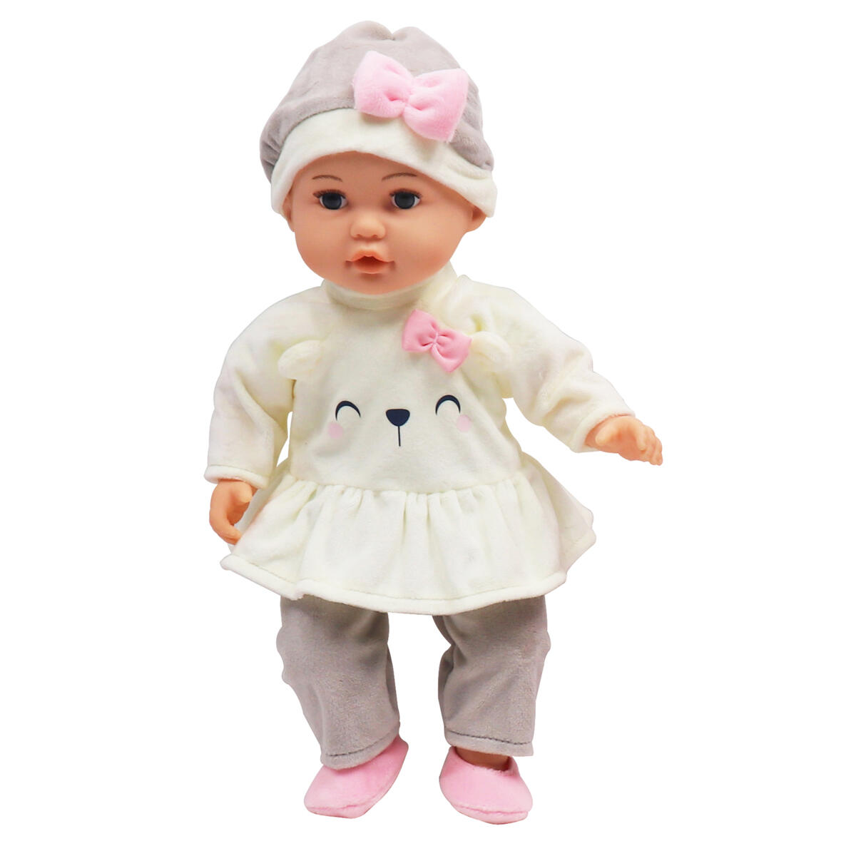 En dukke med bevægelige arme og ben samt blød polstret krop. Jakke, taske, bamse, sut og sutteflaske medfølger. Dukkens arme, hoved og ben er af PVC, uden forbudte ftalater. Længde: 40 cm. Fra 2 år.