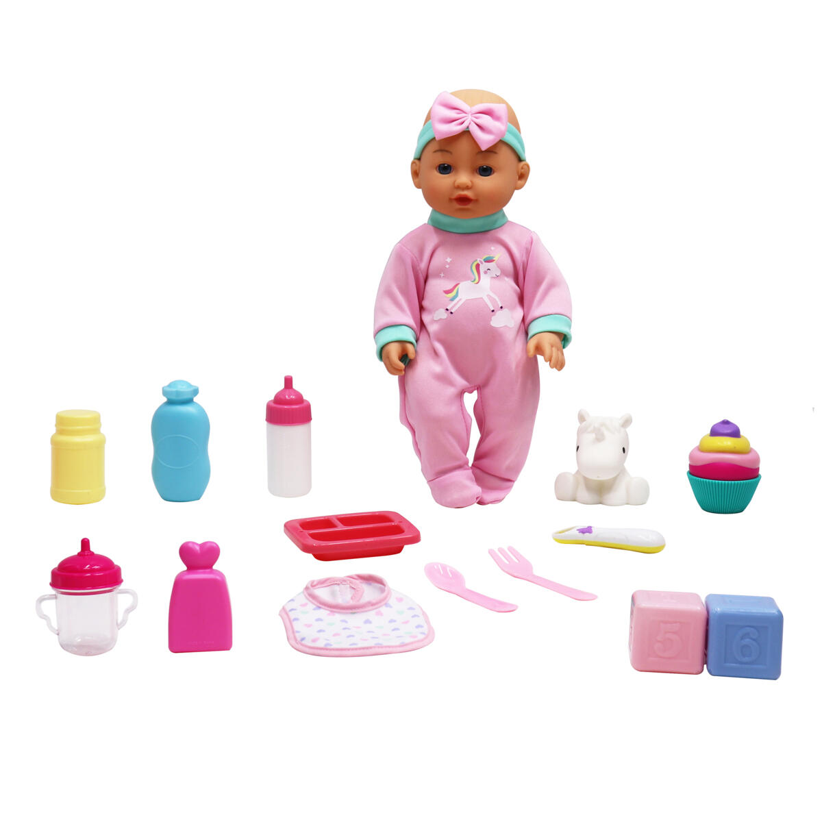 En dukke med bevægelige arme og ben samt blød polstret krop. Jakke, taske, bamse, sut og sutteflaske medfølger. Dukkens arme, hoved og ben er af PVC, uden forbudte ftalater. Længde: 40 cm. Fra 2 år.