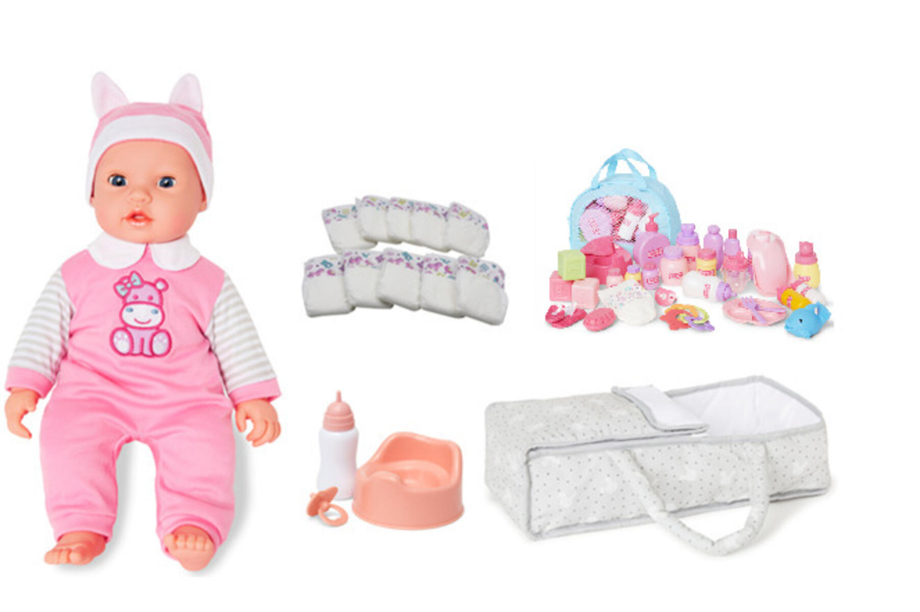 Indeholder dukkeseng med sengesæt, barnevogn, pusletaske, dukkelift og en blød dukke med dukketilbehør. Farverne kan variere. Længden på dukken er 35 cm. Fra 3 år.