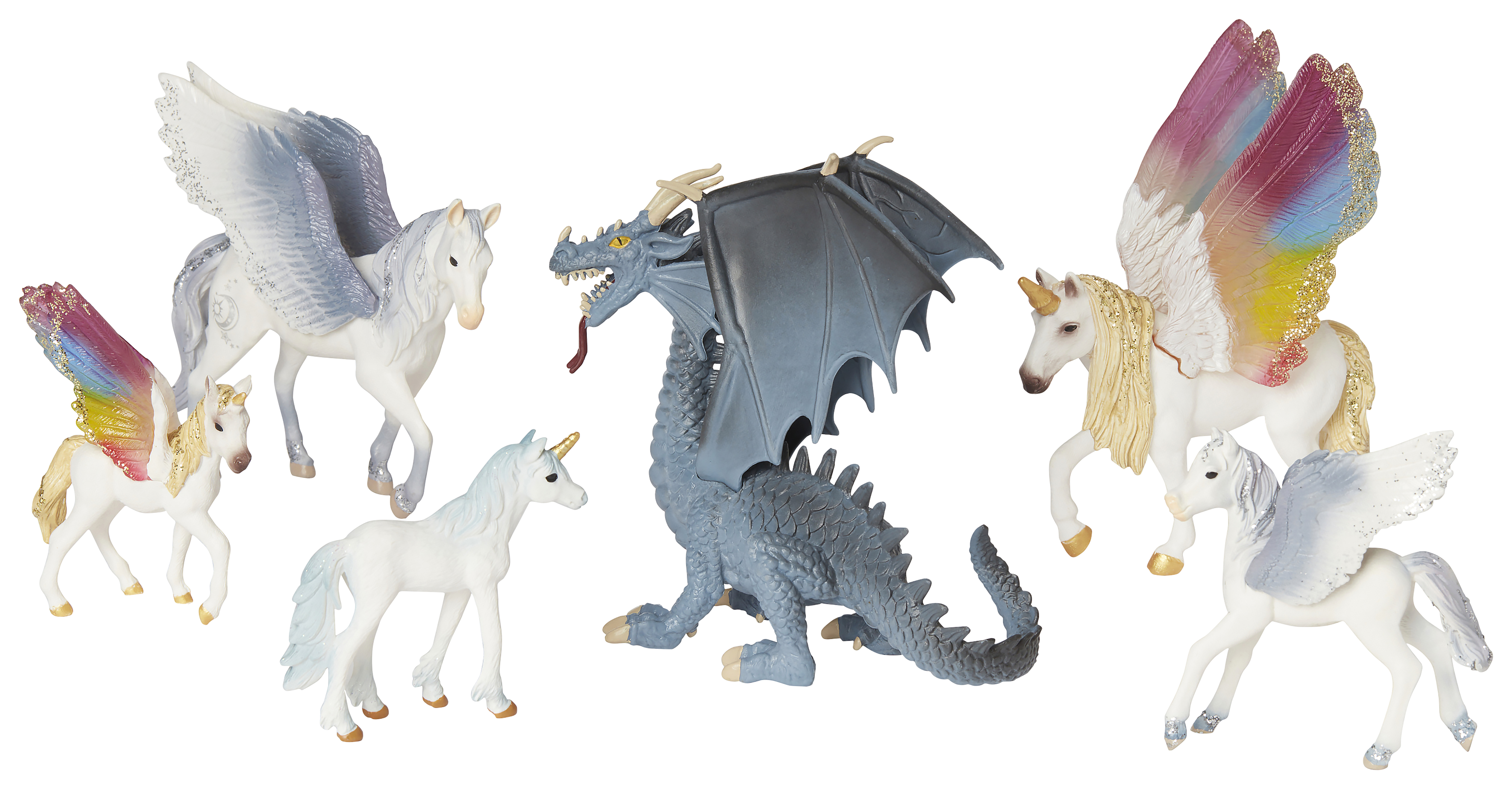 6 stk./pk. Et magisk sæt som indeholder en enhjørning, enhjørningeføl, Pegasus, Pegasus med regnbuemønster, sort Pegasus og en guldfarvet drage. Højde på heste ca. 12 cm. Af PVC, fri for ftalater. Fra 3 år.