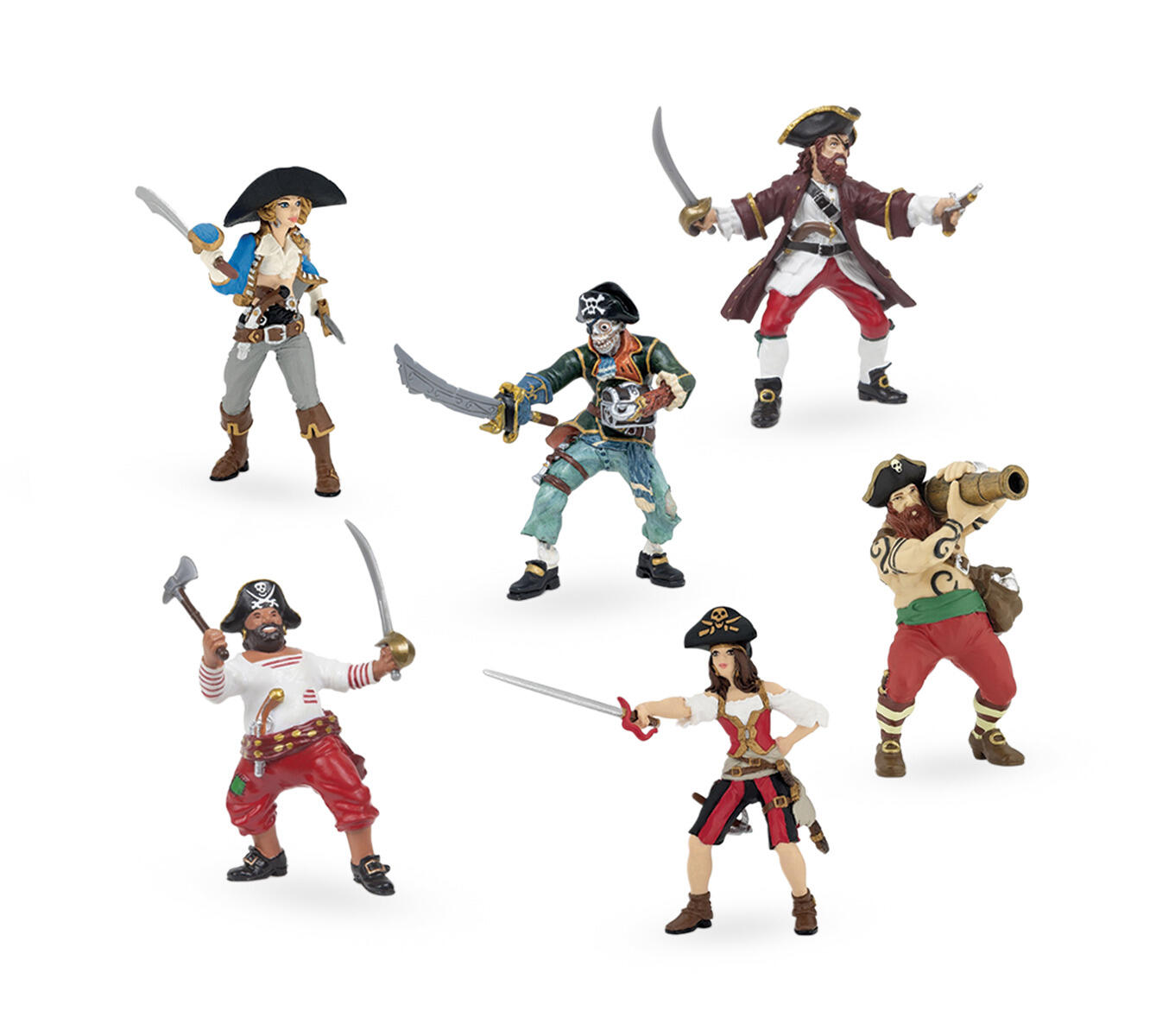 6 stk./pk. Sørøverfigurer i plast. Fremstillet af PVC uden forbudte ftalater. Varierende størrelser fra 8–10,5 cm. Leveres i forskellige kombinationer, og der kan forekomme gentagelser – ofte med 6 ens figurer. Fra 3 år.