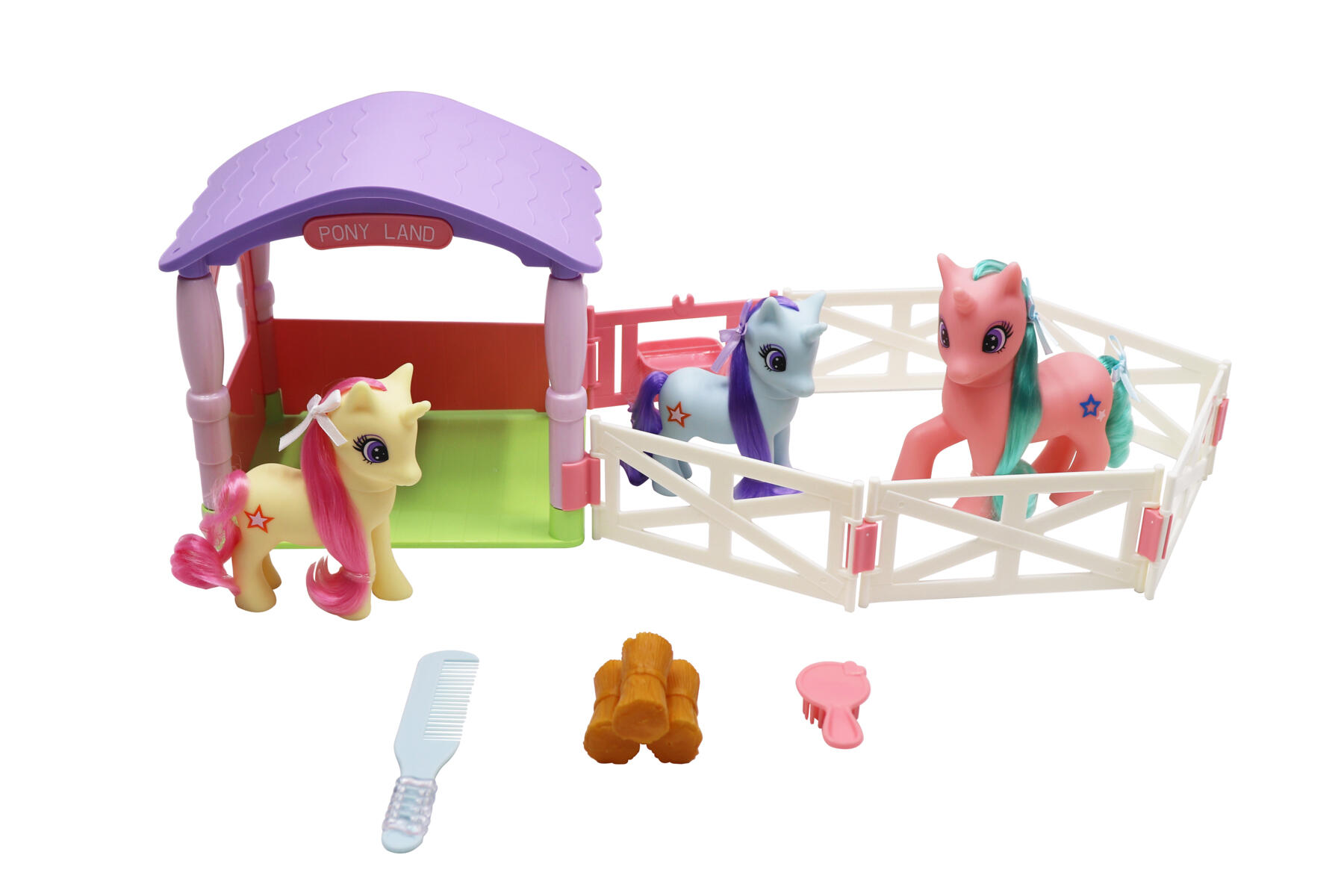 4 dele/pk. En ponyfamilie med lang man som man kan børste og frisere. Indeholder 2 eventyrheste og 2 føl. Længde 14 cm og 10 cm. Af PE og PVC uden forbudte ftalater. Fra 3 år.
