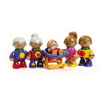 Et sæt hvor børnene kan lære om familien og forskellige generationer. Udvikler sproget, forståelse for relationer og selvfølelsen. Højde 11,5 cm. Indeholder bedstemor, bedstefar, mor, far og en baby. Figurerne har bevægelige arme og ben, en klik-lyd bekræfter bevægelsen. Tryk på maven, og figurerne vil sige en lyd. Af ABS-plast. Fra 1 år.