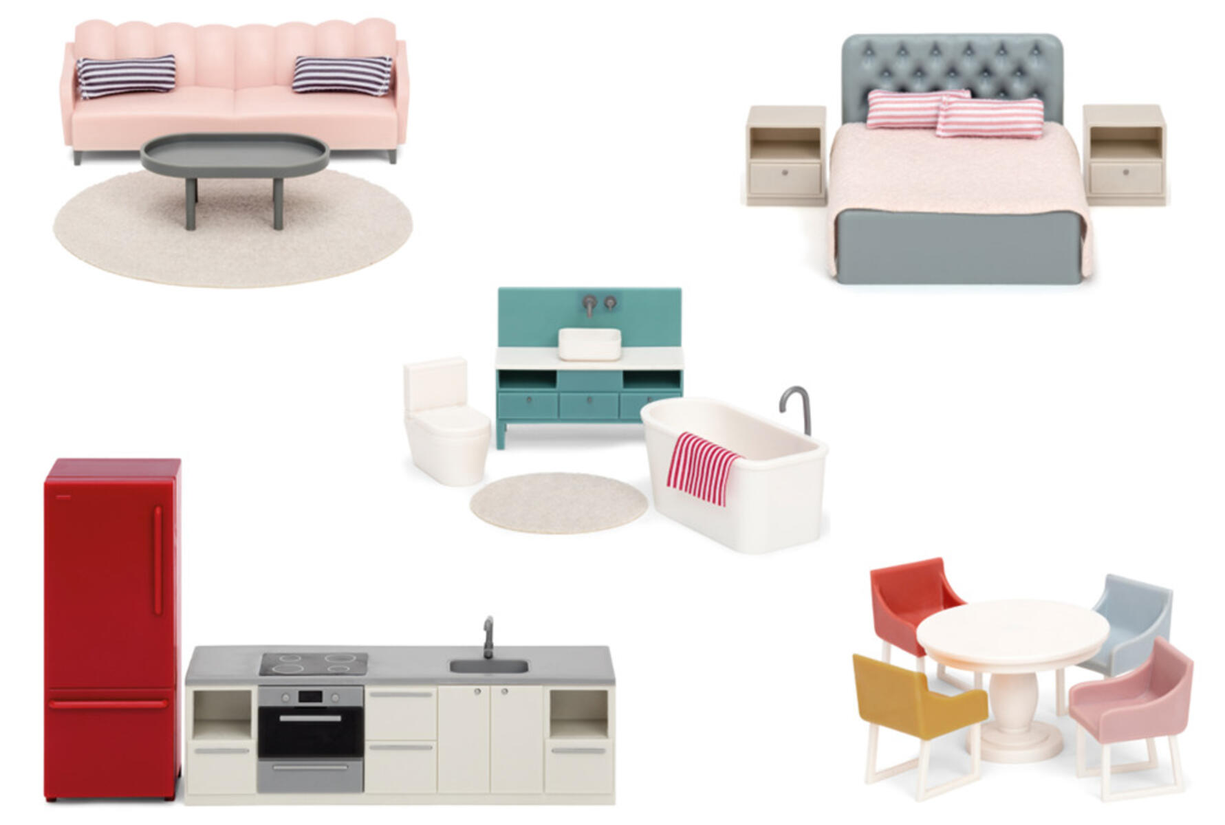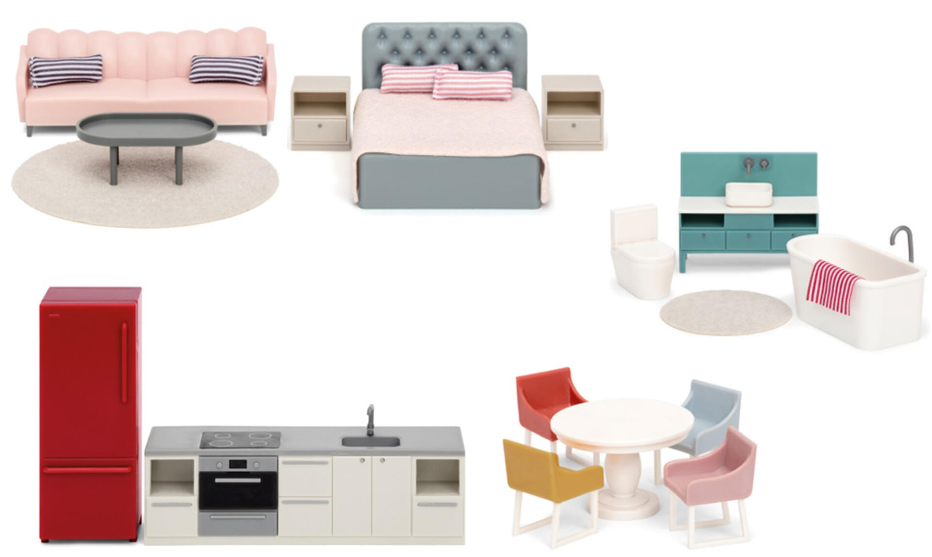 Køb alle 4 sæt. Indeholder: badeværelse, køkken, soveværelse og dagligstue. Af genplantet gummitræ. Mål på seng 32x27 cm, skab 25x9 cm, stol 14x7 cm, sofa 21x11 cm og bad 12x12x32 cm. Passer til barbie og dukkehus med varenr. 17477. Fra 3 år.