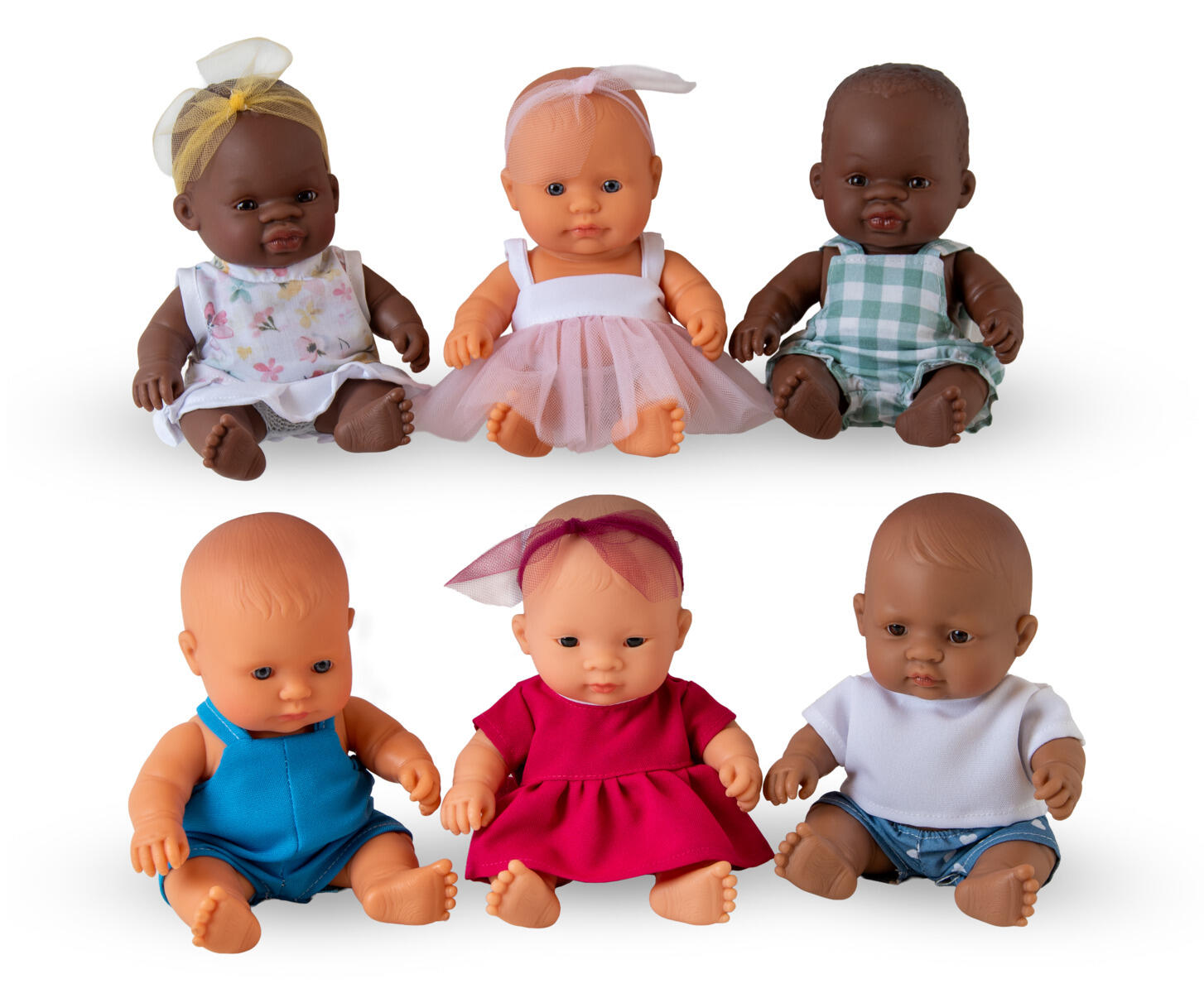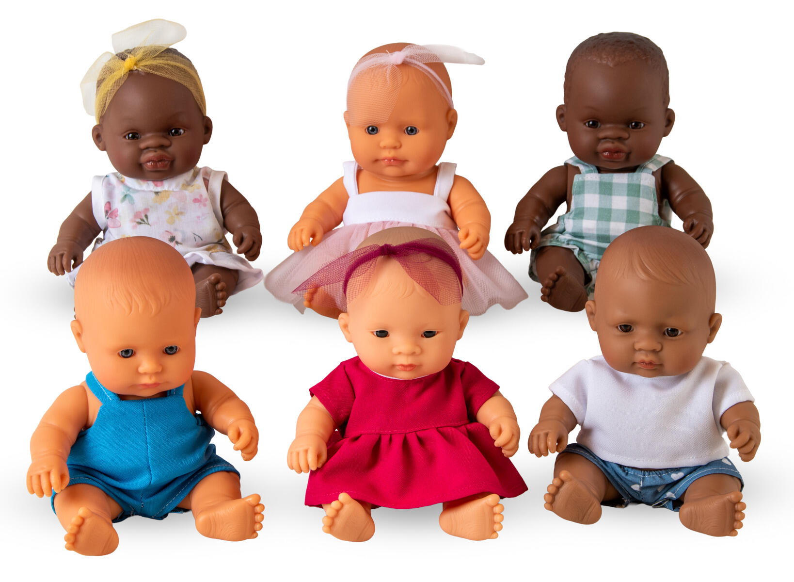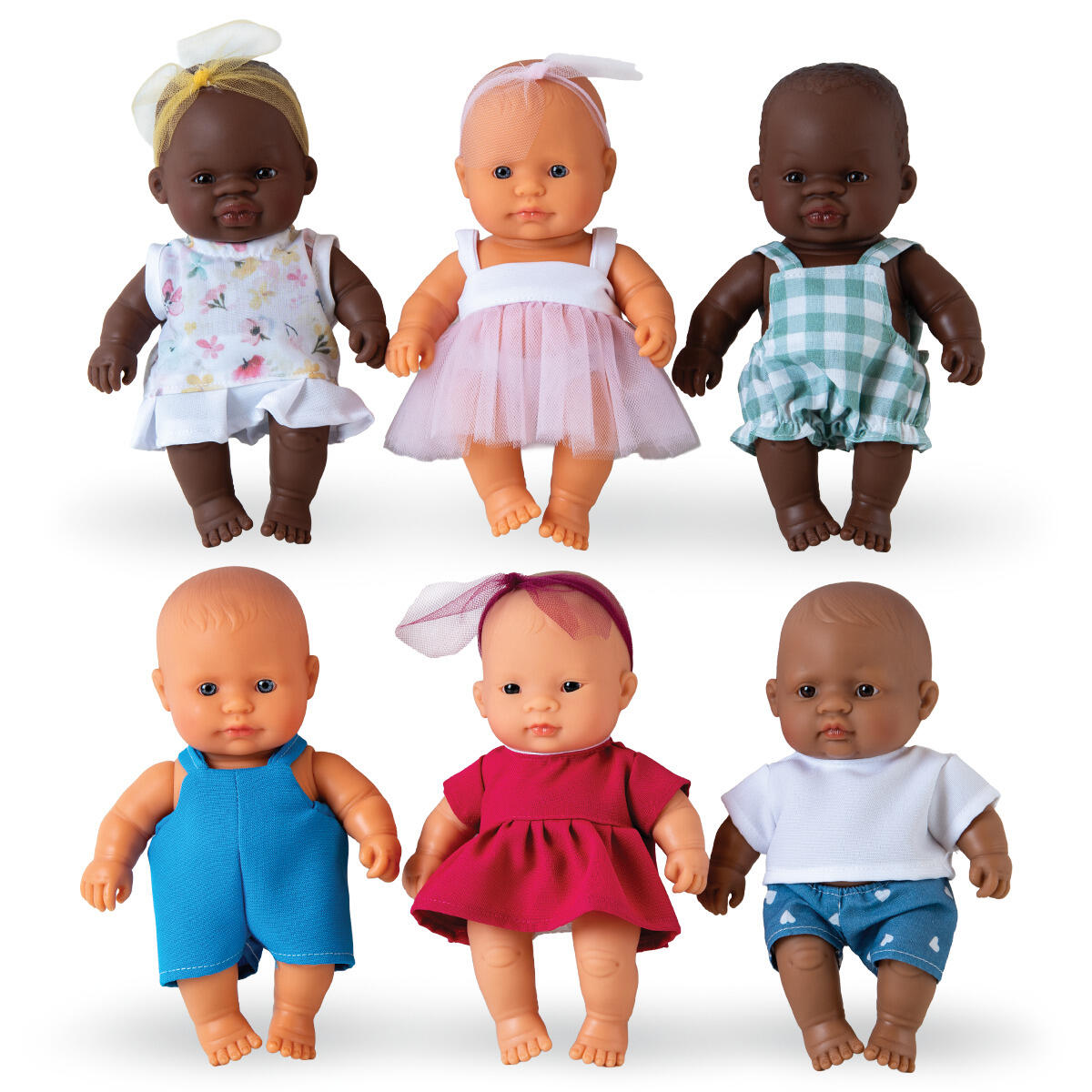 6 stk./pk. Dukker med blød polstret krop. Hoved af PVC, uden forbudte ftalater. Assorterede modeller, dubletter kan forekomme. Længde: 18 cm. Fra 2 år.
