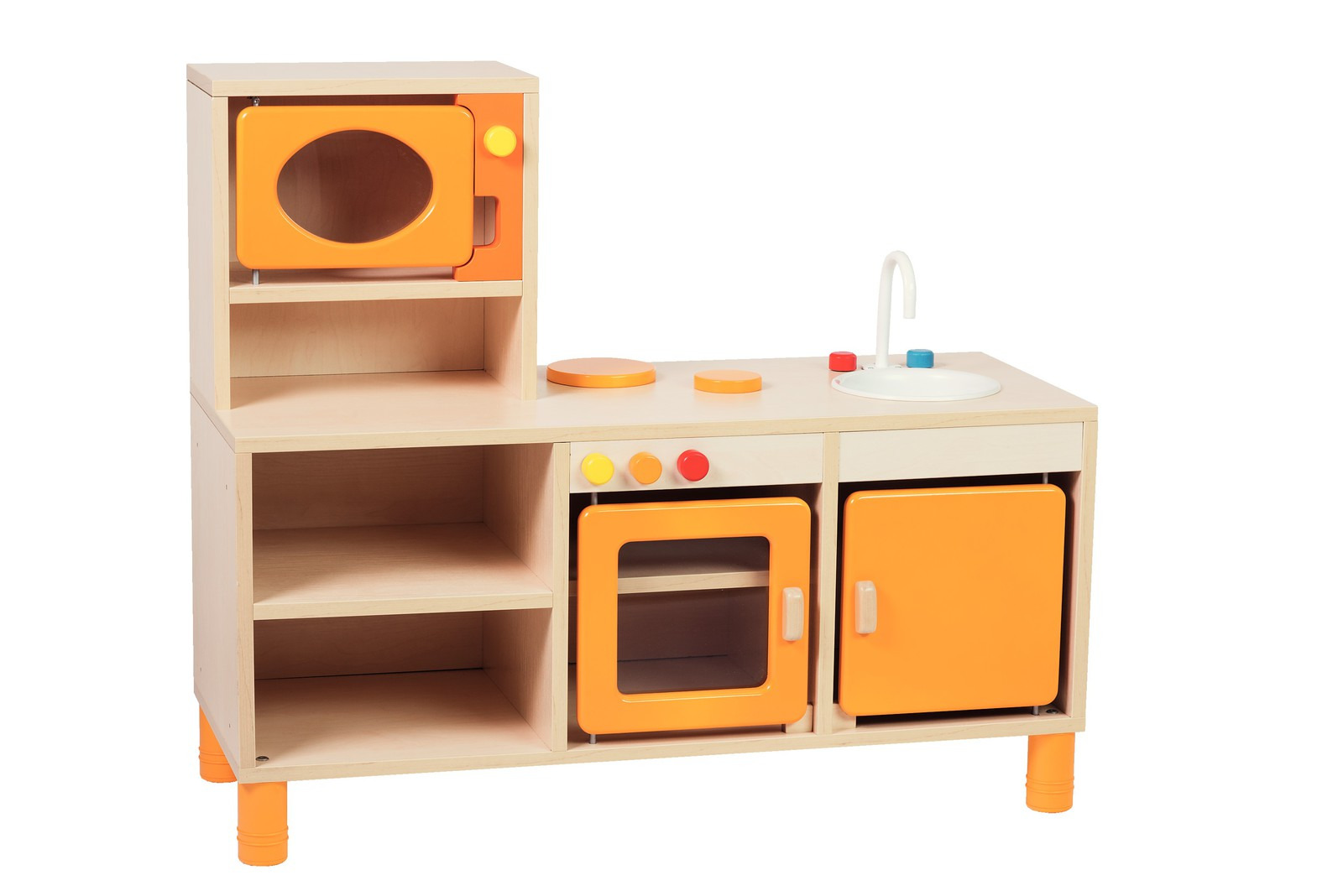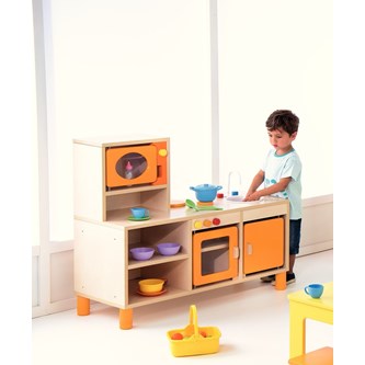 Komplet legekøkken som er tilpasset til børnehaven. Består af 4 dele: komfur (81700), køkkenskab med vask (81701), køkkenskab (81702) og opvaskemaskine (81703). Delene leveres umonteret.