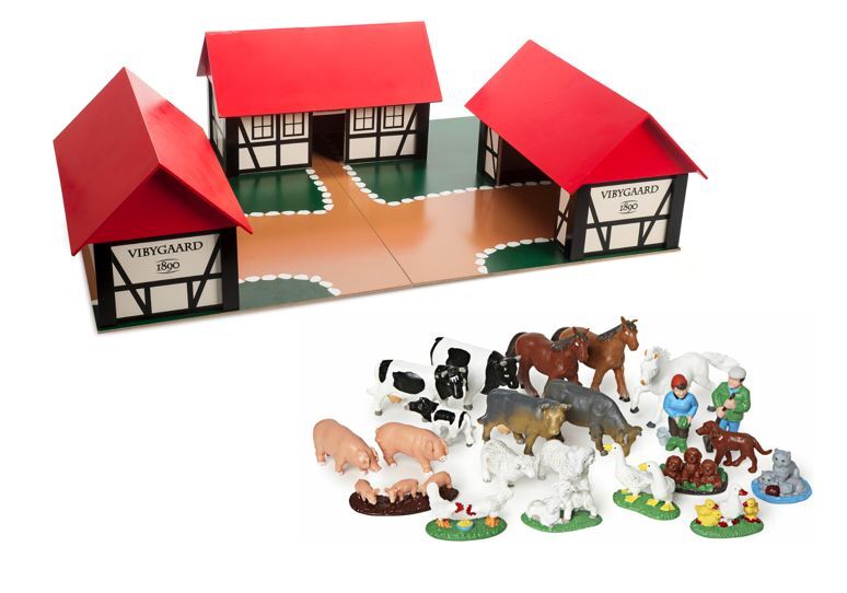 En klassisk bondegård med 2 tilhørende stalde. Flytbare længer med aftagelige tage. Lavet af MDF. PVC-fri. Dyr og traktorer købes separat. Mål: 60x44x16 cm. Fra 3 år.