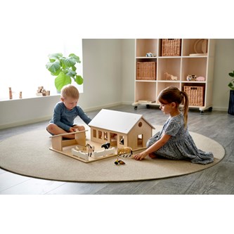 En stor bondegård med udhus og gårdsplads. Huset har mange vinduer, båse til dyr, hegn og et aftageligt tag, som gør det muligt for børnene at lege fra flere vinkler på samme tid. Leveres færdigsamlet. Af tyk, lakeret FSC-certificeret krydsfinér. Dyr medfølger ikke. Mål: 73,5x54x29 cm. Fra 2 år.