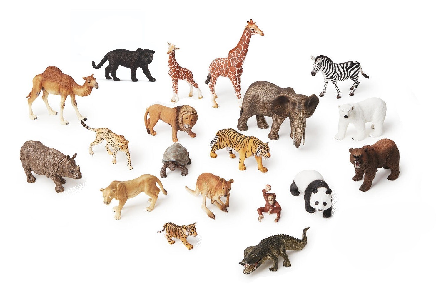 16 stk./pk. Et sæt klassiske dyr fra forskellige dele af verden. Dyrene har mange detaljer og er håndlavede. Alligatoren er 20,5 cm lang og zebraen 8,5 cm høj. Mål: 5-20 cm. Af TPE. Fra 3 år.