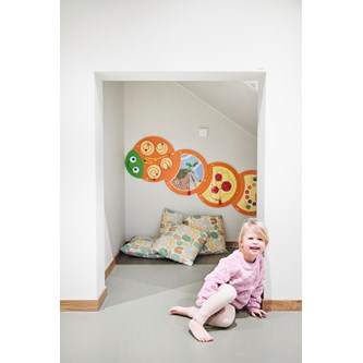 Kombinerer IKT, stimulansrespons og årsag og virkning med finmotorik sammen med et ønske om at udforske. Hver del kræver forskellige teknikker for at tænde lyset. Man kan trykke, skifte, dreje, trække eller skubbe for at få cirklen til at lyse. Kan monteres på væggen eller bruges på et gulv eller bord. Kræver 3 stk. AAA-batterier (sælges separat). Mål: 25x80x4 cm. Fra 10 måneder.