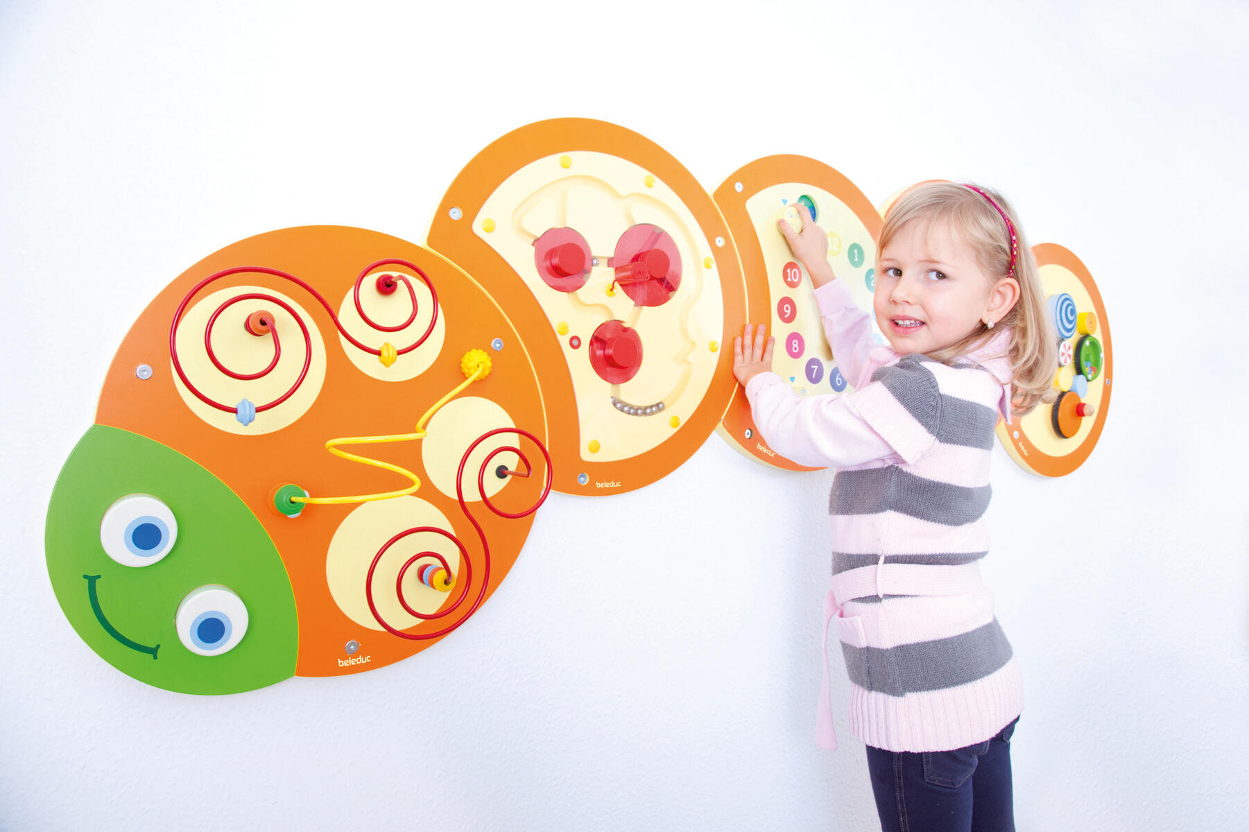 Udnyt gangarealet på en smart måde ved at placere et tusindben der. De 5 forskellige dele træner øje-hånd-koordination, finmotorik, balance og enkel matematik. Af træ. Mål: 193x48 cm. Fra 3 år.