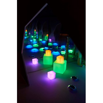 12 stk./pk. Et sæt med genopladelige og selvlysende, runde sten, der kan stables, rulles og sorteres. En fantastisk ressource til sensoriske oplevelser og en ny måde at opmuntre børn til at eksperimentere på. Vælg mellem at vise et spektrum af farver, der skifter automatisk, eller indstil en af de 7 faste farver. Forvandl et almindeligt rum til et sanserum og en kreativ læringsmiljø på ingen tid. Lyser i ca. 10–12 timer efter opladning. 3 forskellige størrelser, mål: ø 4,5–15 cm. Af ABS. PVC-fri. Fra 1 år.