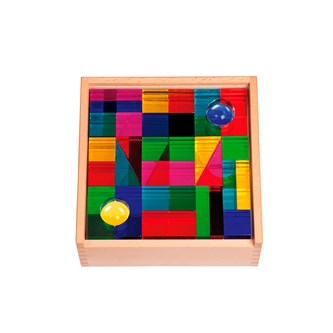 94 dele. Fine klodser i glasklare farver og forskellige former. Man kan bruge dem til at lave fantasifulde og smukke arkitekturer af lys. Kan med fordel anvendes på lysbord eller sammen med spejl. 14 transparente plader medfølger. Mål på plader: 14x14 cm. Af akrylplast. Leveres i opbevaringsæske af træ. Fra 3 år.