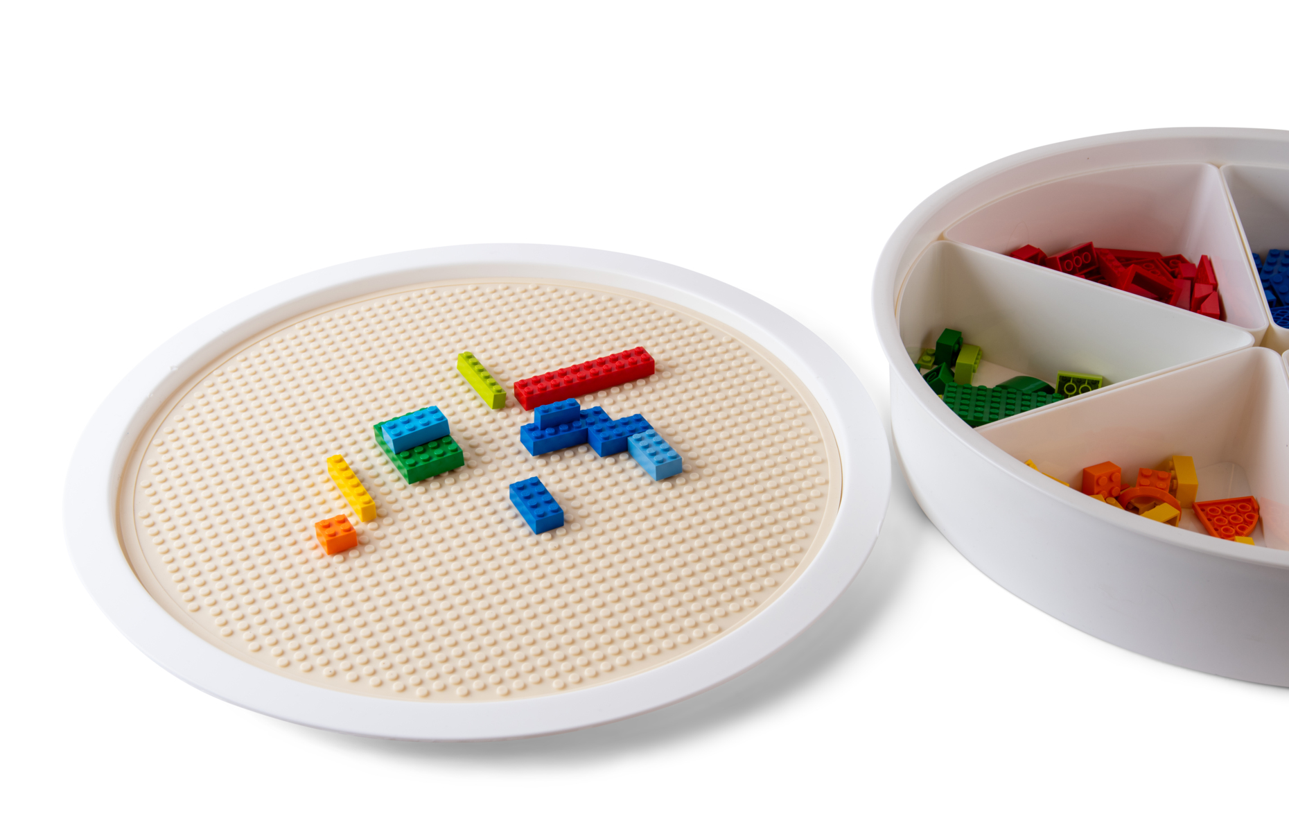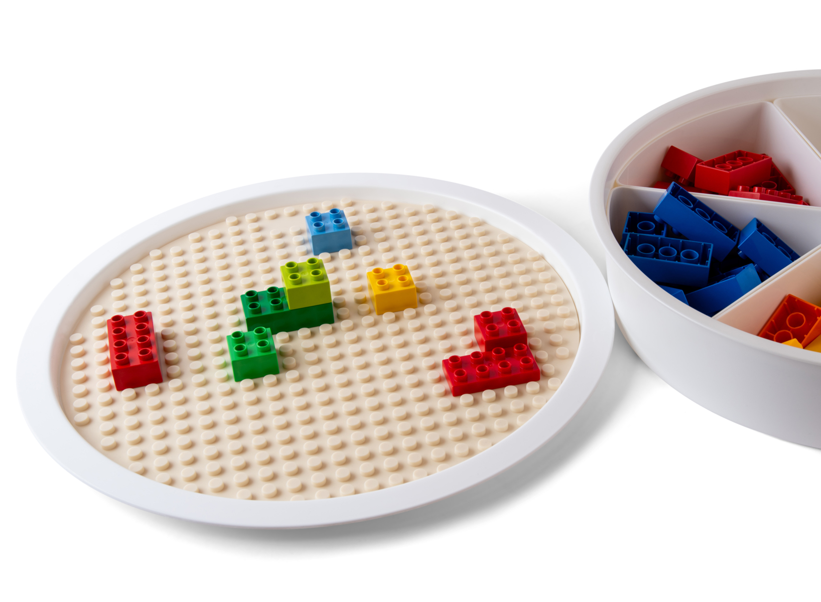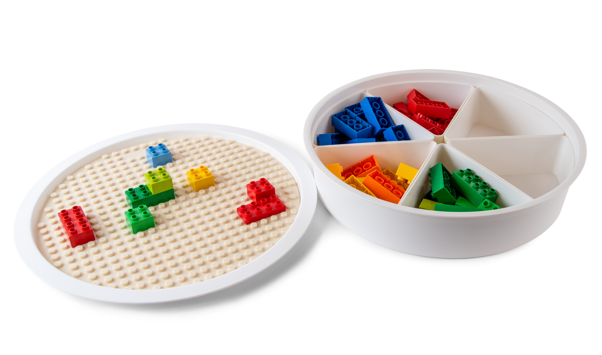 Sensorisk sorteringsboks med aftagelige rum og låg. Nem at rengøre, flytte rundt og opbevare. Komplementeres med en fleksibel dobbeltsidet byggeplade i silikone. Den ene side kan bruges til små byggeklodser og den anden til lidt større byggeklodser. Kompatibel med førende mærker. Størrelse: 45x45x11,5 cm. Af harpiks. PVC-fri. Fra 3 år.