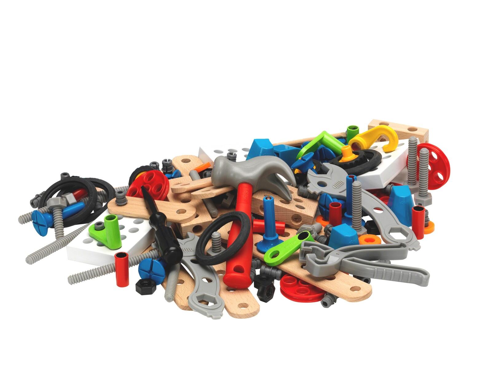 201 dele. Indeholder blandt andet skruetrækker, hammer, nøgle, tandhjul, møtrikker og bolte. Det åbne konstruktionssystem stimulerer fantasien og barnets lyst til at eksperimentere, samtidig med at øje-hånd-koordinationen trænes. Mål: 31x30x7 cm. Af ABS, PP og træ. PVC-fri. Fra 3 år.