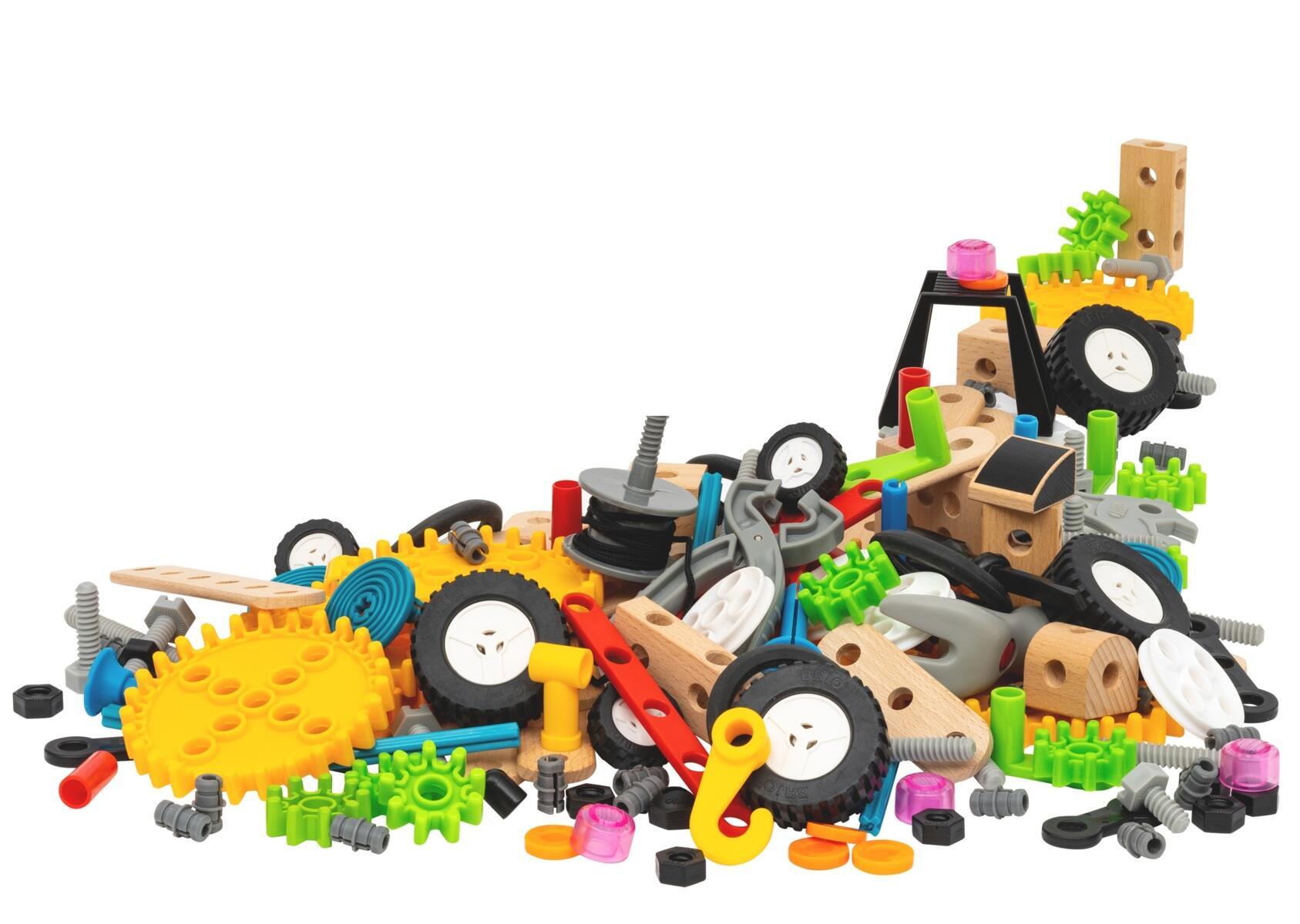 201 dele. Indeholder blandt andet skruetrækker, hammer, nøgle, tandhjul, møtrikker og bolte. Det åbne konstruktionssystem stimulerer fantasien og barnets lyst til at eksperimentere, samtidig med at øje-hånd-koordinationen trænes. Mål: 31x30x7 cm. Af ABS, PP og træ. PVC-fri. Fra 3 år.