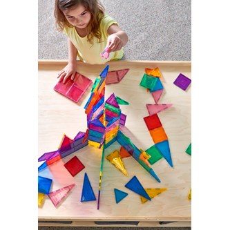 Magna-Tiles er store magnetiske byggeplader, som er rigtig sjove at bygge med. Store og små, tre- og firkantede transparente farvede plader, som tiltrækker hinanden, når børnene bygger. 100 dele hvoraf der er tre forskellige trekanter og to forskellige kvadratiske former. Mål på kvadrat 7,5x7,5 cm og 15x15 cm. Af ABS-plast. Fra 3 år.
