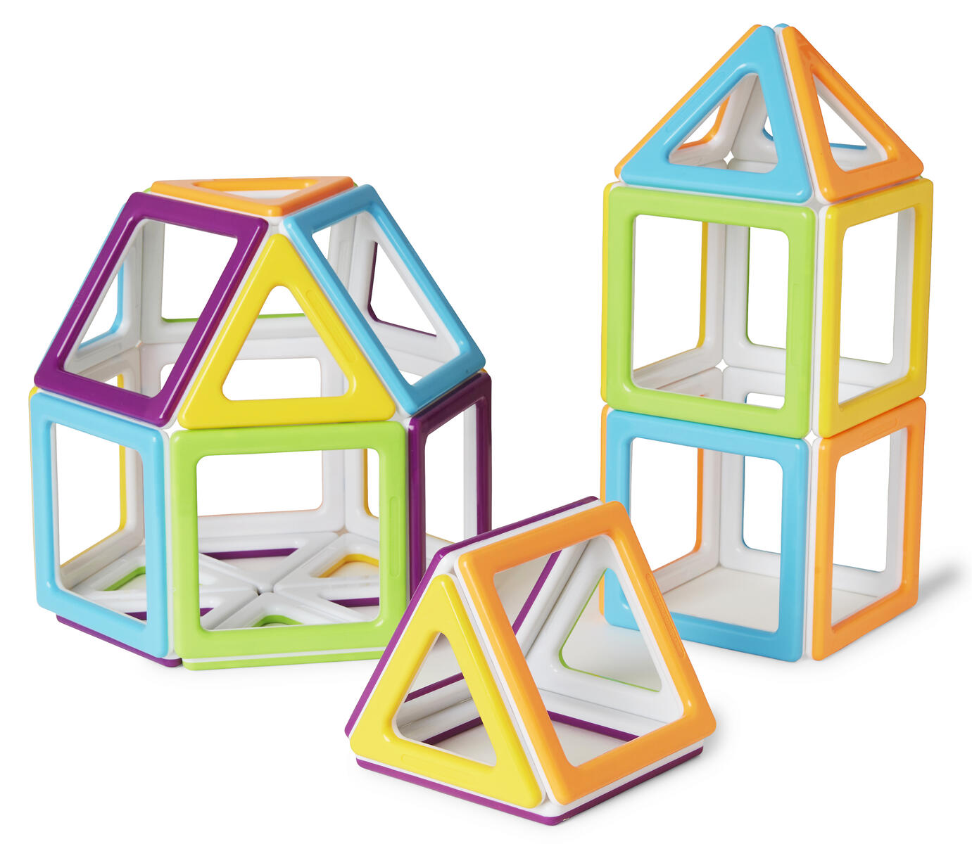 96 dele. Lad barnet udforske former og magnetisme gennem sjov og lærerig byggeleg. Sættet indeholder 36 kvadrater og 60 trekanter i 4 forskellige farver. Mål på kvadrat: 6x6 cm, trekant: 5,5x5,5 cm. Håndvaskes med alkoholbaseret overfladedesinfektion. Opbevaringskasse medfølger. Af ABS-plast. Fra 3 år.
