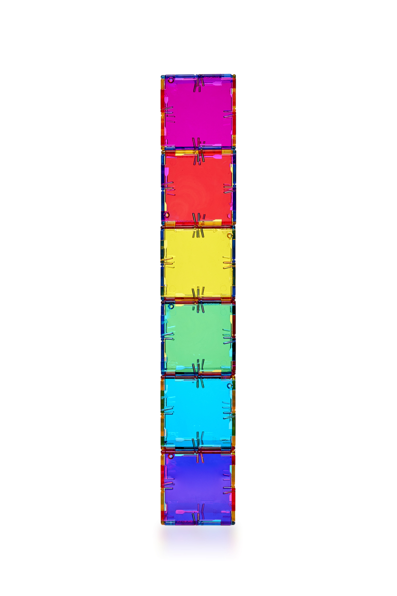 Magna-Tiles er magnetiske byggeplader, som består af store og små tre- og firkantede, transparente plader i forskellige farver, som tiltrækker hinanden, når børnene bygger. Består af tre forskellige trekanter og to forskellige kvadratiske former. Mål på kvadrat 7,5x7,5 cm og 15x15 cm. Af ABS-plast. Fra 3 år.