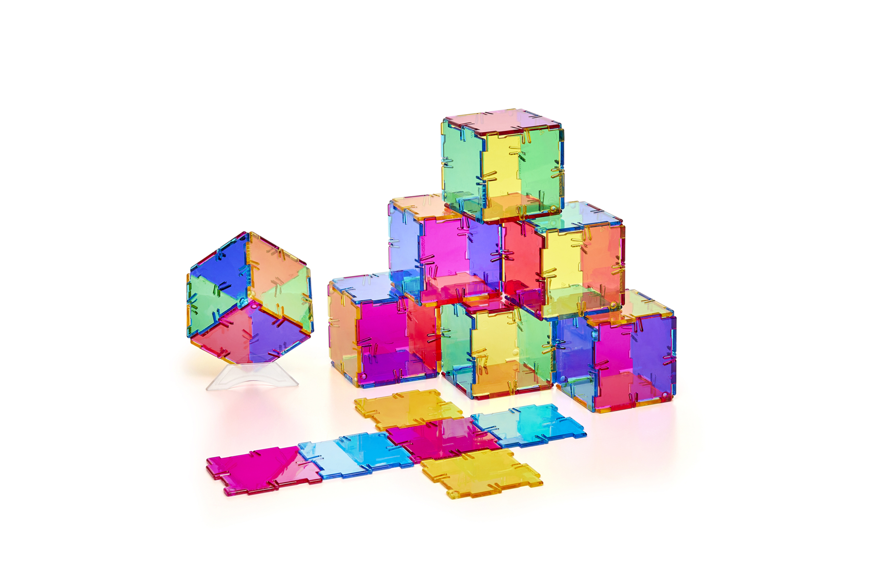 96 dele. Lad barnet udforske former og magnetisme gennem sjov og lærerig byggeleg. Sættet indeholder 36 kvadrater og 60 trekanter i 4 forskellige farver. Mål på kvadrat: 6x6 cm, trekant: 5,5x5,5 cm. Håndvaskes med alkoholbaseret overfladedesinfektion. Opbevaringskasse medfølger. Af ABS-plast. Fra 3 år.