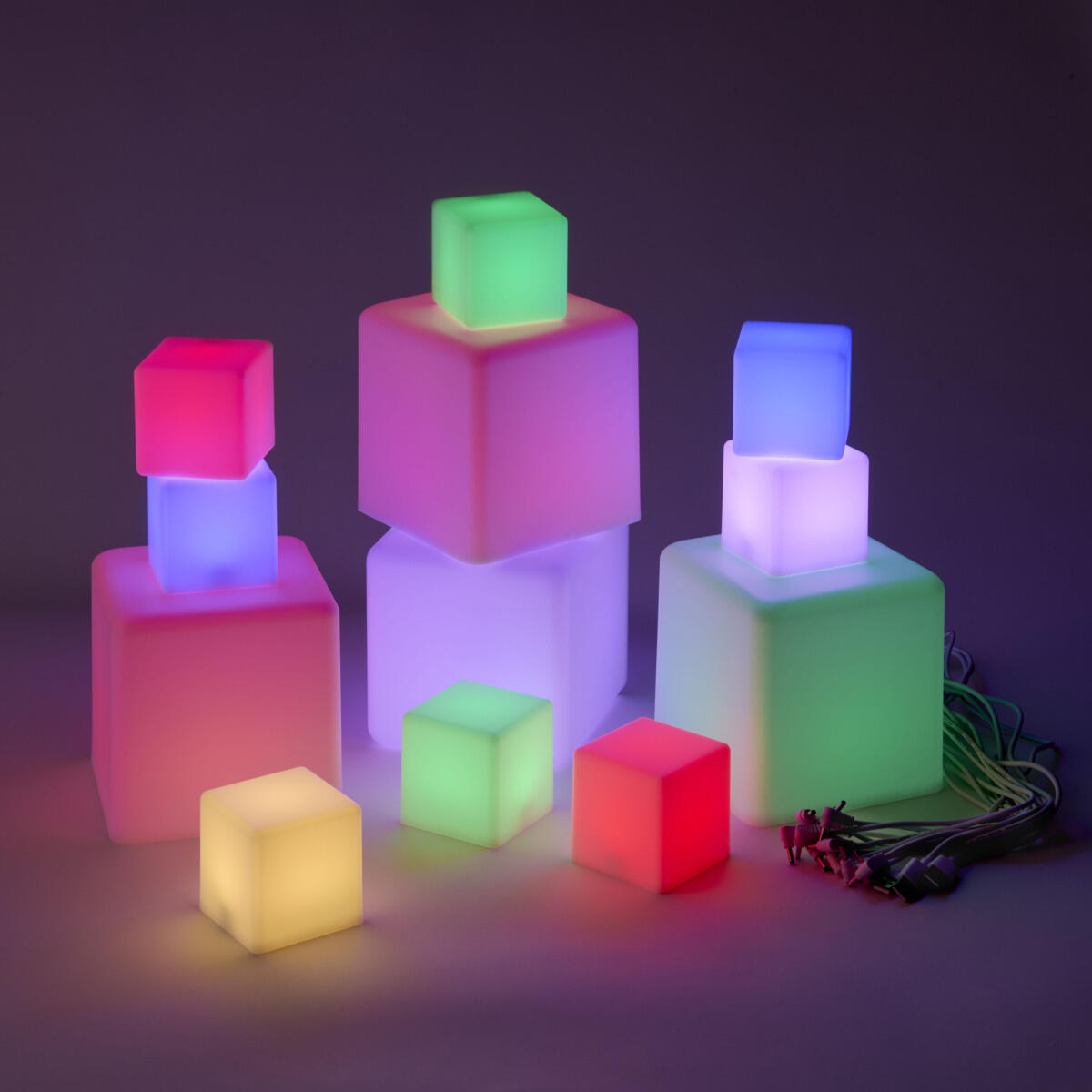 Lysende kuber, der skifter farve, når de vendes. Kombinér gerne med transparente klodser eller byggeklodser for at lyse en iglo eller et farvet vindue op. Genopladelige med USB-kabel. Af PP. PVC-fri. Fra 0 år.