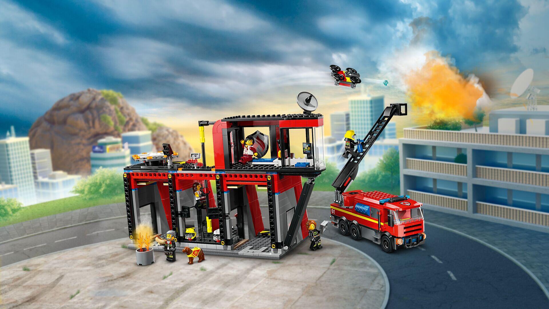 843 dele. Følg holdet på den sejeste brandstation i LEGO® City. Planlæg redningsmissioner i det moderne kontrolcenter på øverste etage. Tag brandstangen ned til udstyrsområdet og maskinrum 1 og 2. Monter stigen eller 360-gradersslukkeren bag på brandbilen. Start derefter RC-dronen fra helikopterpladsen, hent din trofaste brandhund, og drag ud på endnu en actionfyldt brandmission! Materiale: ABS. PVC-fri. Fra 6 år.