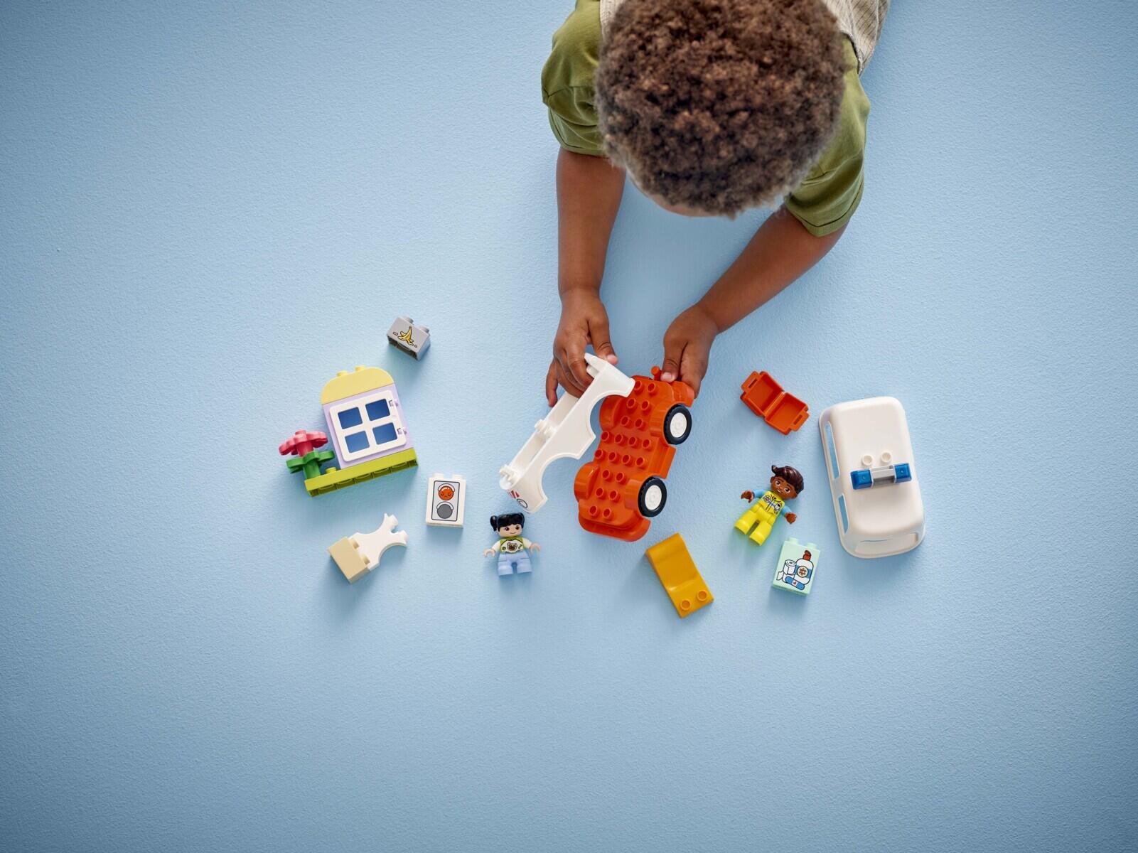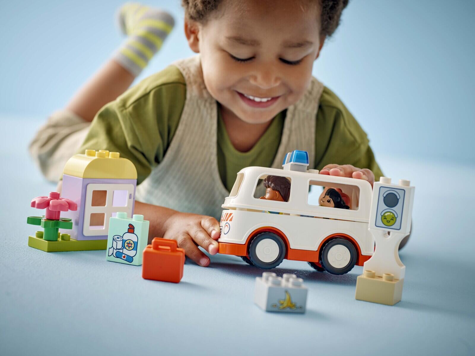 19 dele. Små børn bliver hverdagens helte, når de kører deres ambulance for at hjælpe pigen, som er gledet på en bananskræl! Med udgangspunkt i egne erfaringer fra lægebesøg kan de lege, hvad en redder gør for at hjælpe. De små griber førstehjælpskassen for at hjælpe pigen på stedet, og derefter hjælper de hende forsigtigt ind i ambulancen og kører hende til hospitalet. Materiale: ABS. PVC-fri. Fra 2 år.