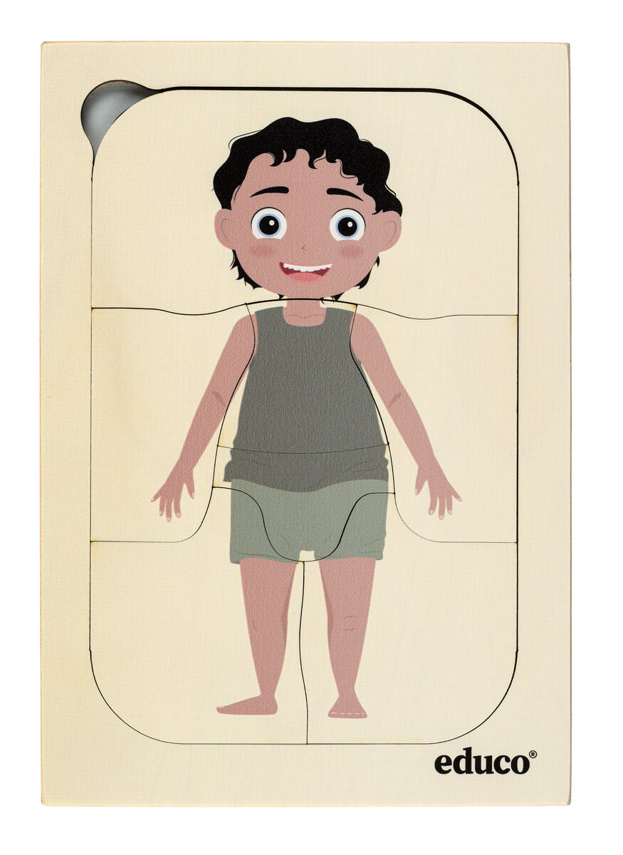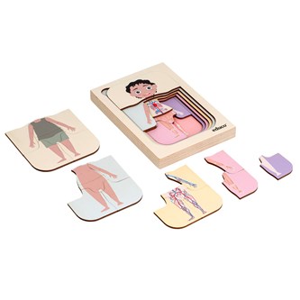24 brikker. Puslespil i 6 lag. Motivet viser menneskekroppen: skelettet, organerne, musklerne og blodcirkulationen. Mål: 20,5x34 cm. Af FSC-certificeret træ. Fra 4 år.