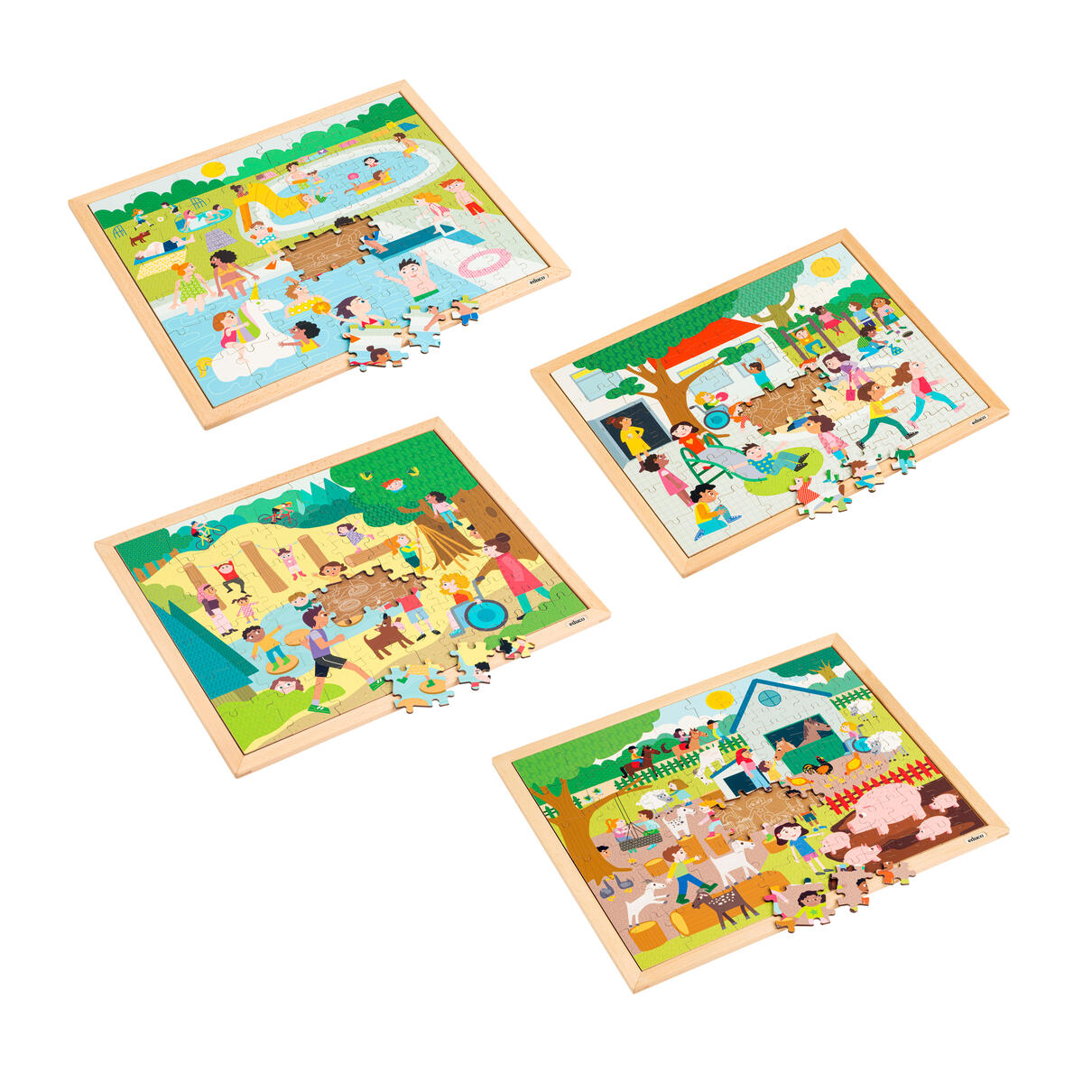 4 stk./pk. 102 brikker i hvert puslespil. Rammepuslespil med store brikker i venstre side og små i højre side. Perfekt puslespil, hvor børnene kan øve sig i at samarbejde. Mål: 50x40 cm. Af FSC-certificeret træ. Fra 5 år.