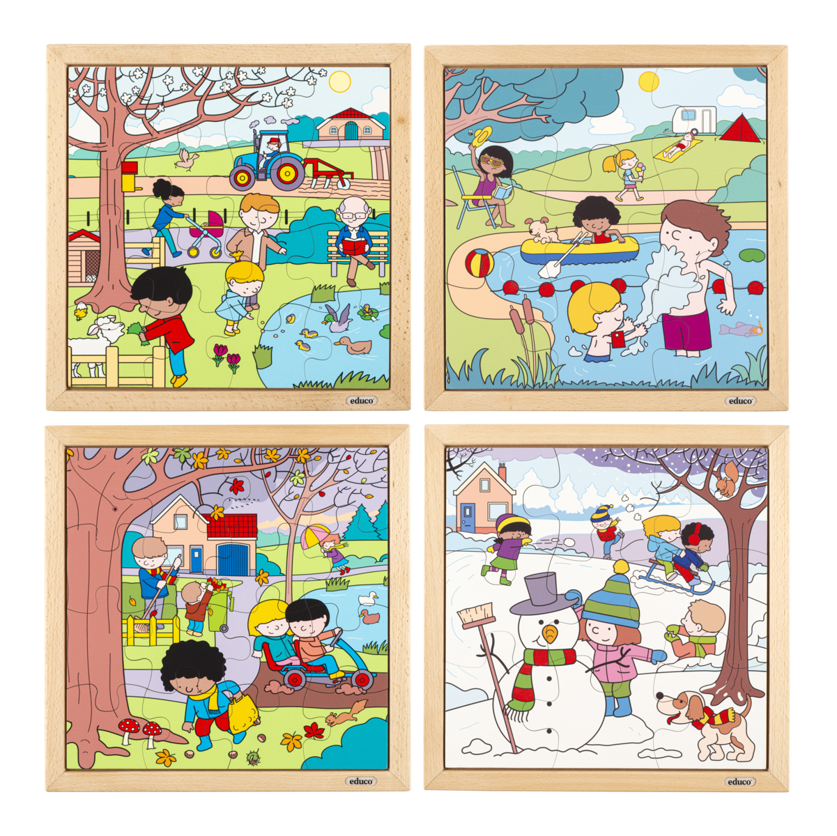 4 stk./pk. Se, hvad der sker på gården i løbet af de fire årstider. De 4 farverige puslespil viser den samme gård i løbet af de fire årstider med aktiviteter, som passer til årstiderne. 30 dele af håndsavet træ. Mål: 29,5x20 cm. Af FSC-certificeret træ. Fra 3 år.