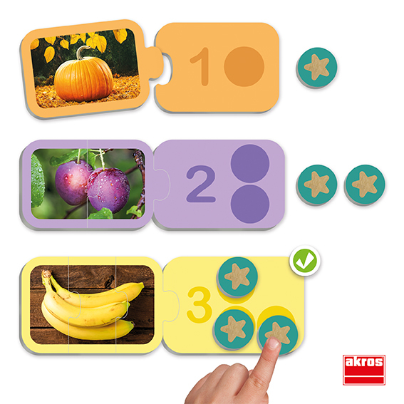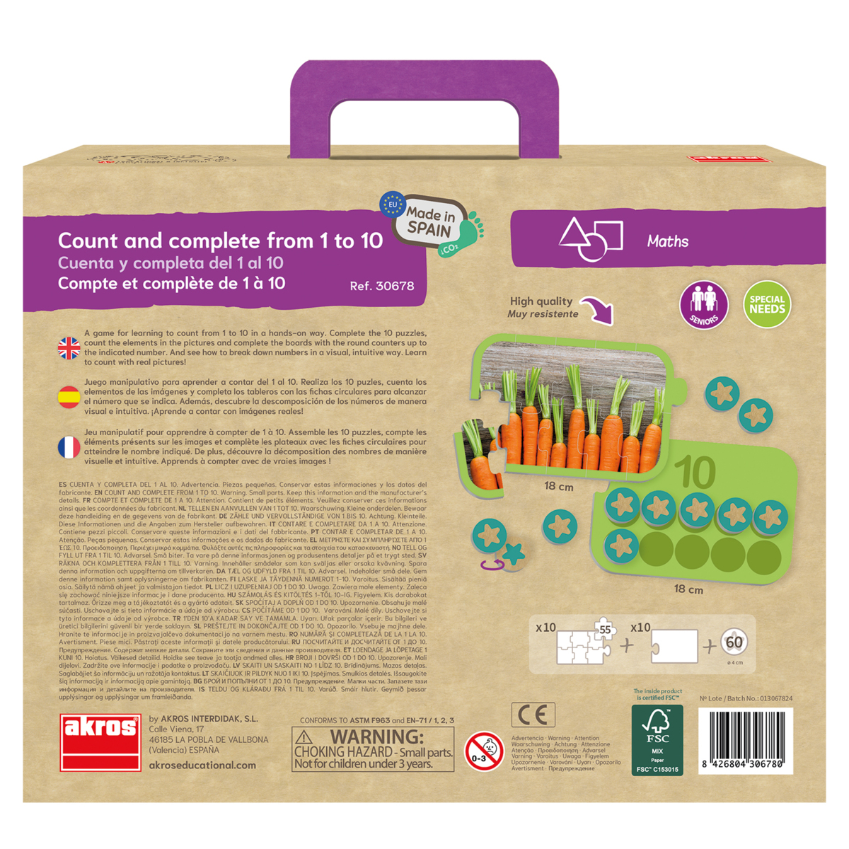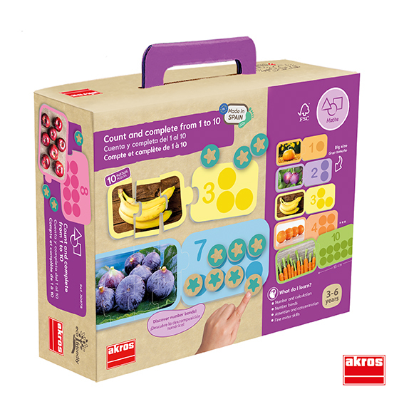 Et spil, hvor man lærer at tælle fra 1-10 på en konkret måde. Saml de 10 puslespil, tæl tingene på de flotte billeder, og læg lige så mange markører som der er ting. Mål på et puslespil: 18x12 cm. Materiale: pap. FSC. Fra 3 år.