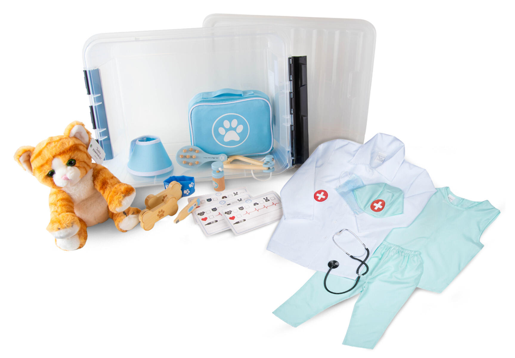 12 dele. Alt man skal bruge til at undersøge, om dyrene er syge eller har brug for et plaster. Mål: 8,5 x 15 x 20 cm. Af FSC-certificeret træ, polyester og bomuld. PVC-fri. Fra 3 år.